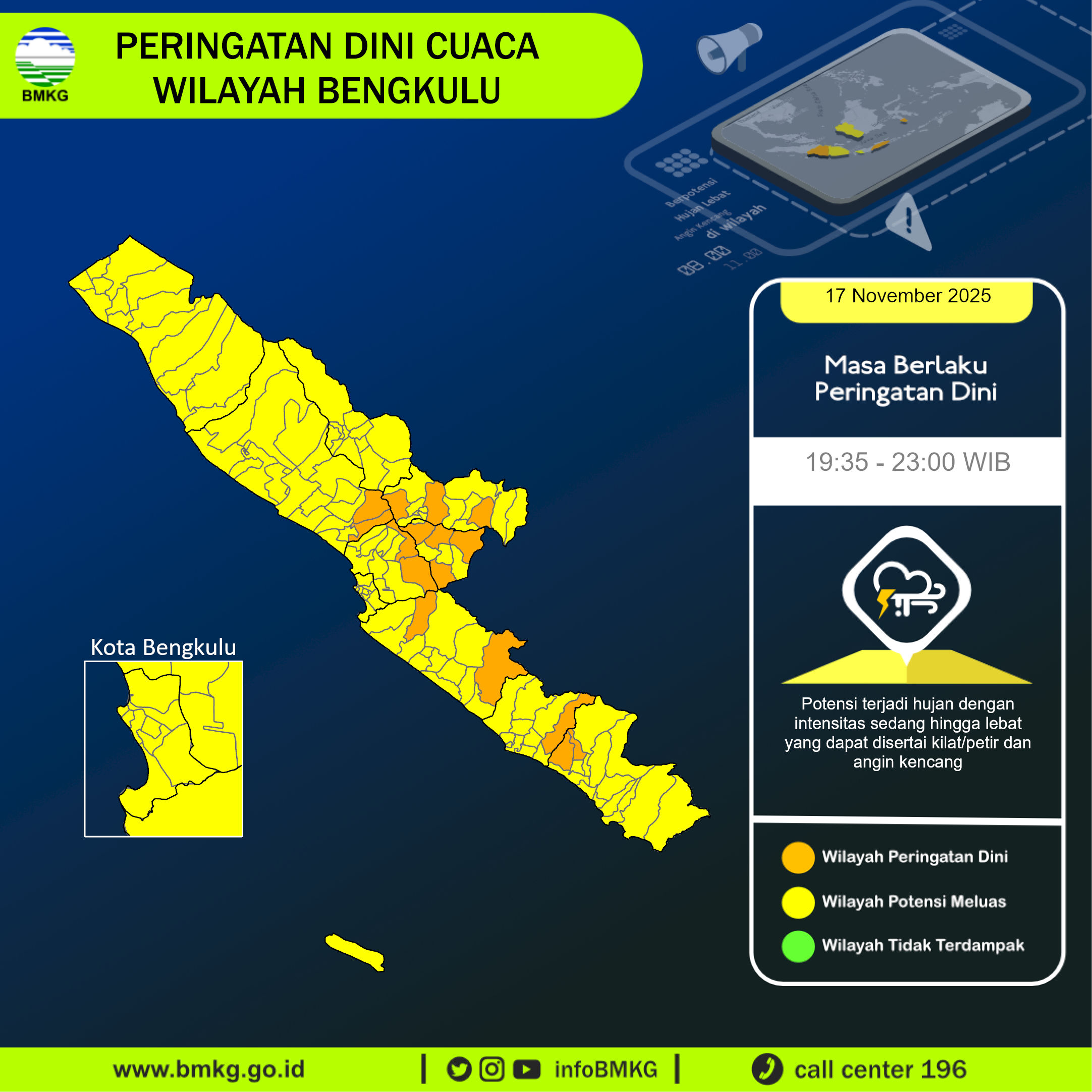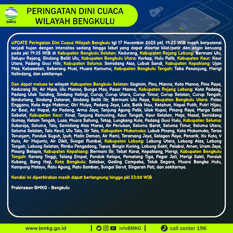 UPDATE Peringatan Dini Cuaca Wilayah Bengkulu tgl 17 November 2025 pkl. 19:25 WIB berpotensi terjadi hujan dengan intensitas sedang hingga lebat yang dapat disertai kilat/petir dan angin kencang pada pkl 19:35 WIB di