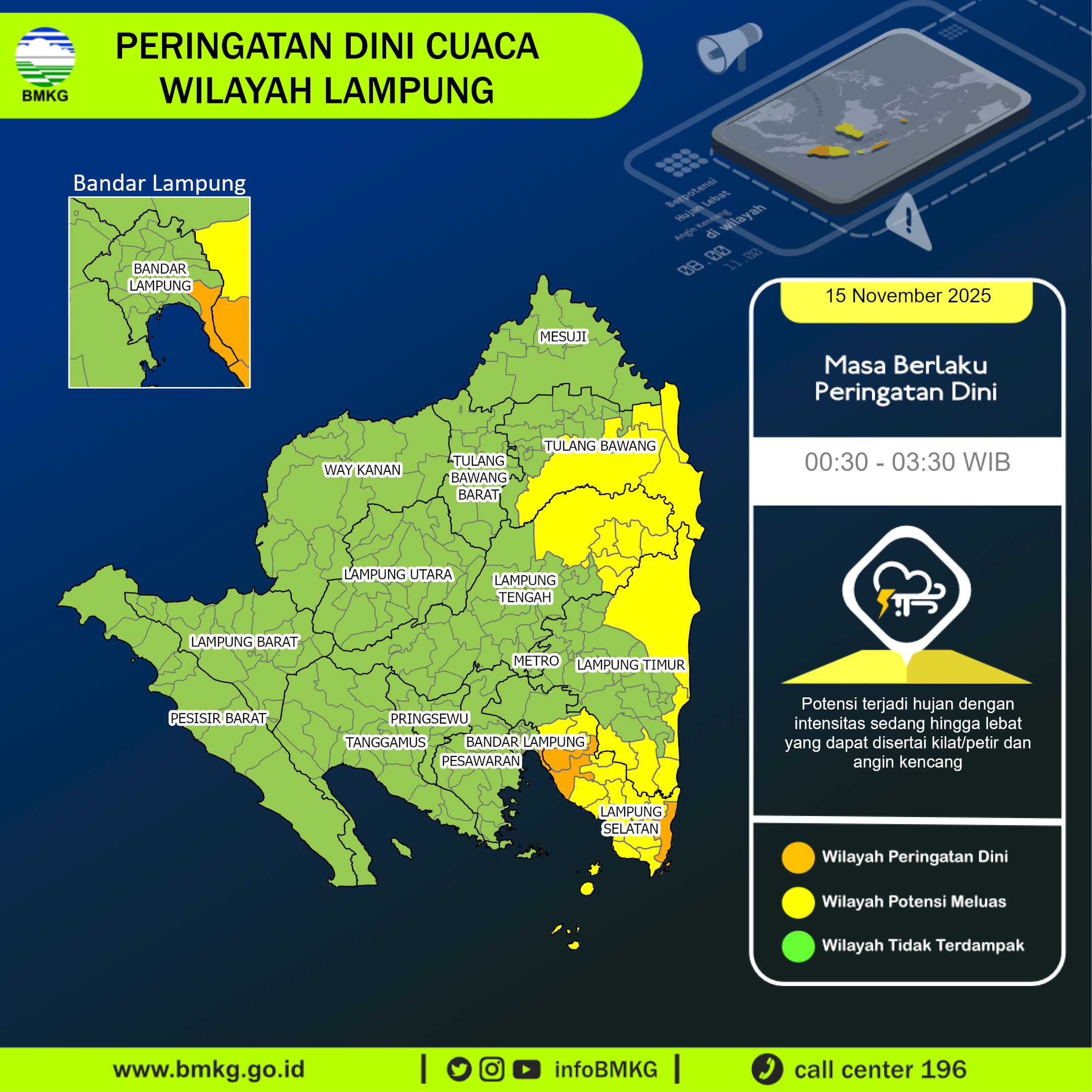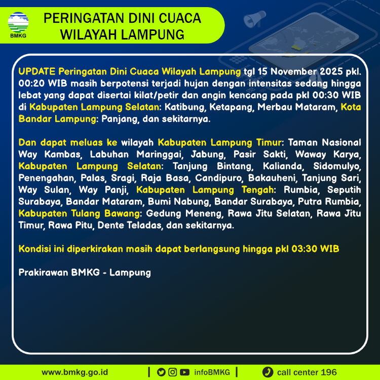 UPDATE Peringatan Dini Cuaca Wilayah Lampung tgl 15 November 2025 pkl. 00:20 WIB berpotensi terjadi hujan dengan intensitas sedang hingga lebat yang dapat disertai kilat/petir dan angin kencang pada pkl 00:30 WIB di