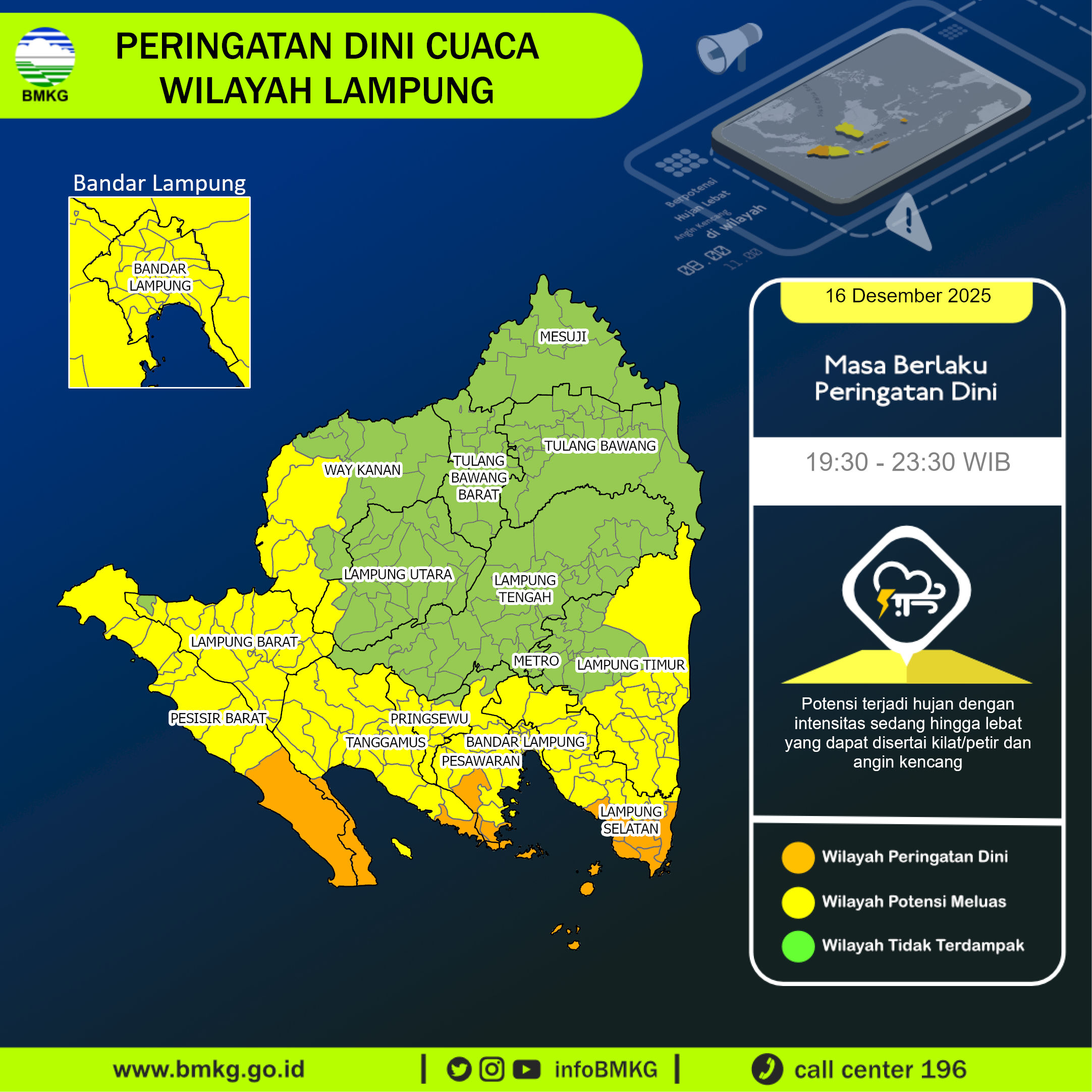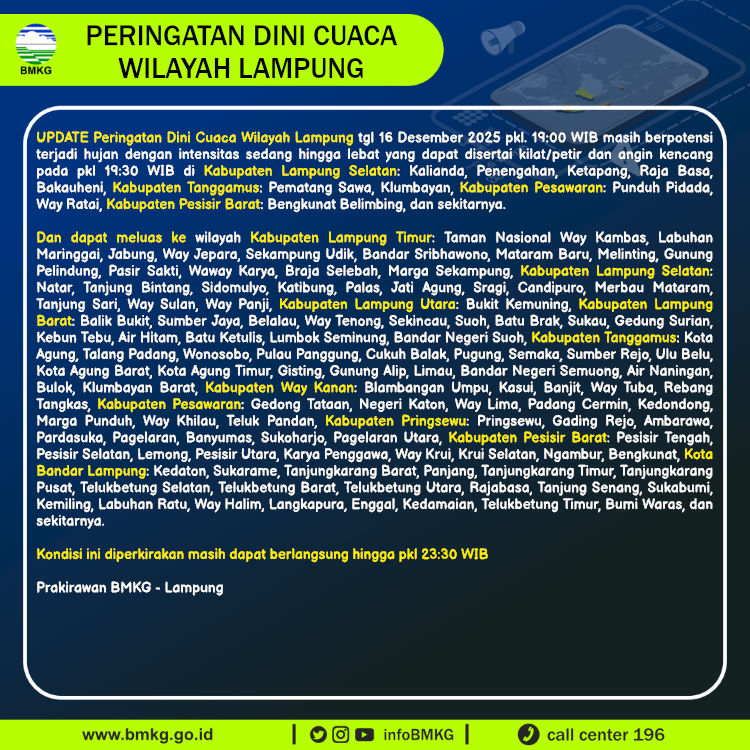 UPDATE Peringatan Dini Cuaca Wilayah Lampung tgl 16 Desember 2025 pkl. 19:00 WIB berpotensi terjadi hujan dengan intensitas sedang hingga lebat yang dapat disertai kilat/petir dan angin kencang pada pkl 19:30 WIB di