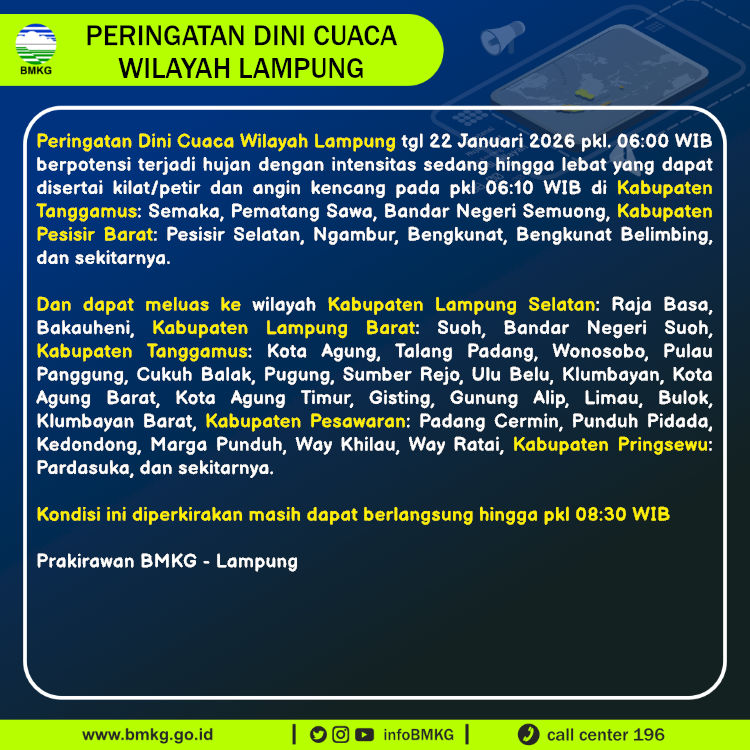 Peringatan Dini Cuaca Wilayah Lampung tgl 22 Januari 2026 pkl. 06:00 WIB berpotensi terjadi hujan dengan intensitas sedang hingga lebat yang dapat disertai kilat/petir dan angin kencang pada pkl 06:10 WIB di