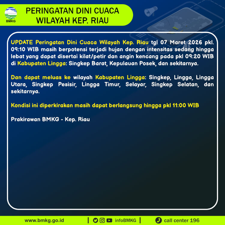 UPDATE Peringatan Dini Cuaca Wilayah Kep. Riau tgl 07 Maret 2026 pkl. 09:10 WIB berpotensi terjadi hujan dengan intensitas sedang hingga lebat yang dapat disertai kilat/petir dan angin kencang pada pkl 09:20 WIB di