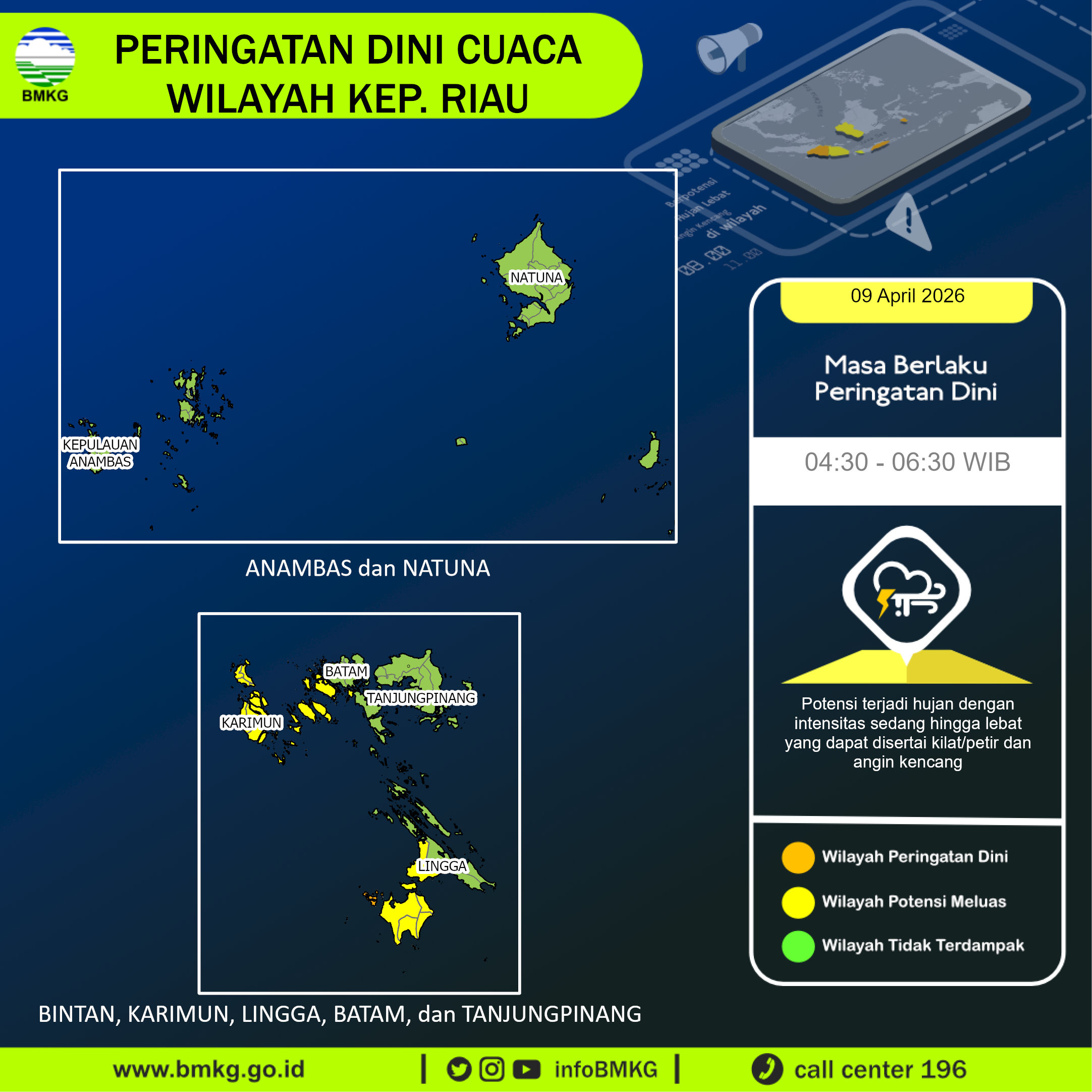 Peringatan Dini Cuaca Wilayah Kep. Riau tgl 09 April 2026 pkl. 04:16 WIB berpotensi terjadi hujan dengan intensitas sedang hingga lebat yang dapat disertai kilat/petir dan angin kencang pada pkl 04:30 WIB di