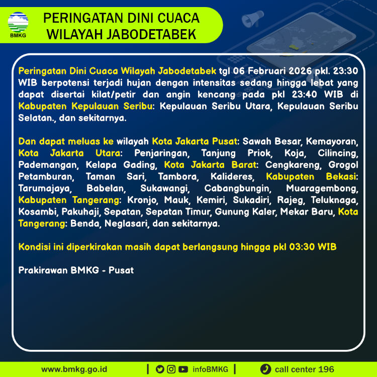Peringatan Dini Cuaca Wilayah Jabodetabek tgl 06 Februari 2026 pkl. 23:30 WIB berpotensi terjadi hujan dengan intensitas sedang hingga lebat yang dapat disertai kilat/petir dan angin kencang pada pkl 23:40 WIB di
