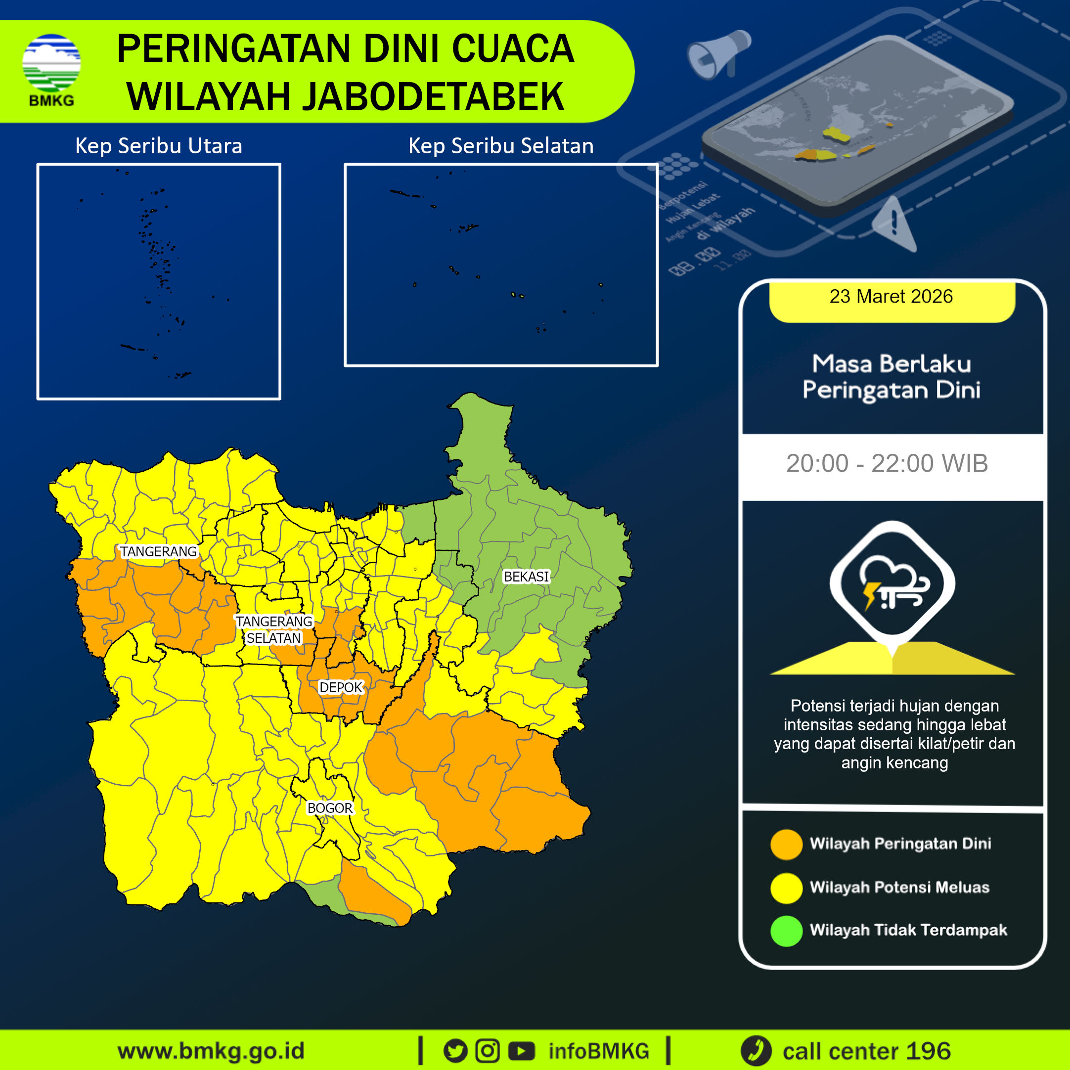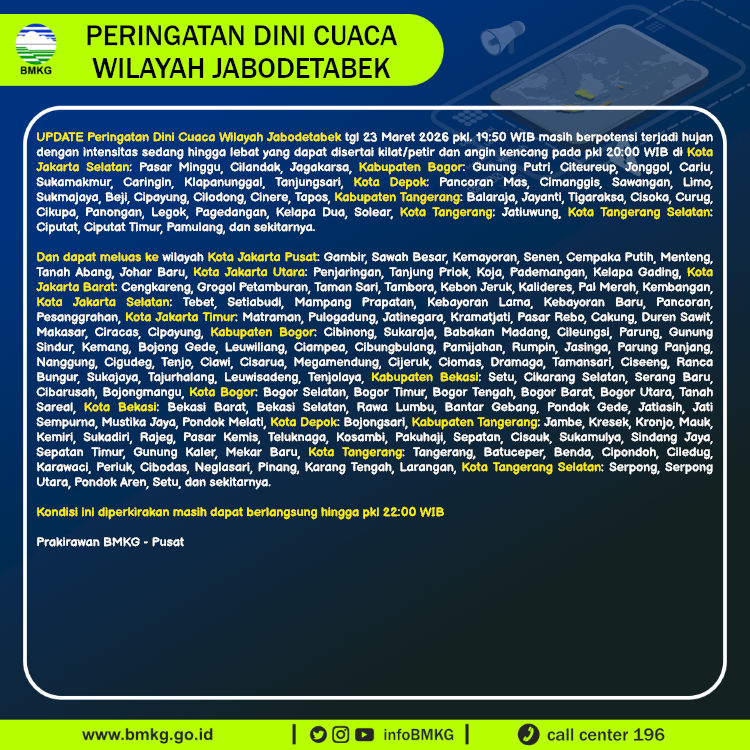 UPDATE Peringatan Dini Cuaca Wilayah Jabodetabek tgl 23 Maret 2026 pkl. 19:50 WIB berpotensi terjadi hujan dengan intensitas sedang hingga lebat yang dapat disertai kilat/petir dan angin kencang pada pkl 20:00 WIB di