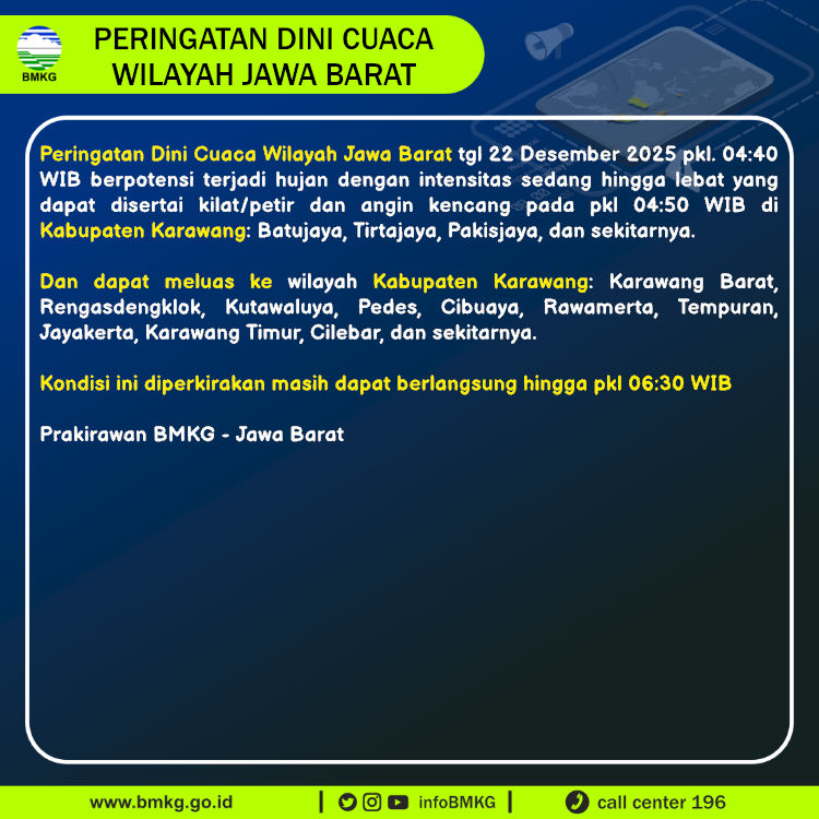 Peringatan Dini Cuaca Wilayah Jawa Barat tgl 22 Desember 2025 pkl. 04:40 WIB berpotensi terjadi hujan dengan intensitas sedang hingga lebat yang dapat disertai kilat/petir dan angin kencang pada pkl 04:50 WIB di