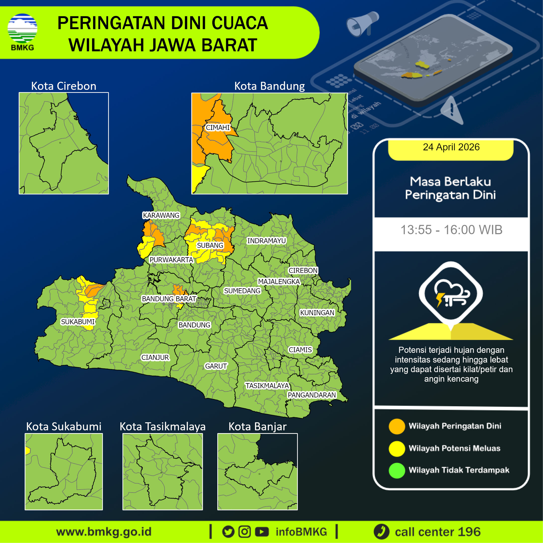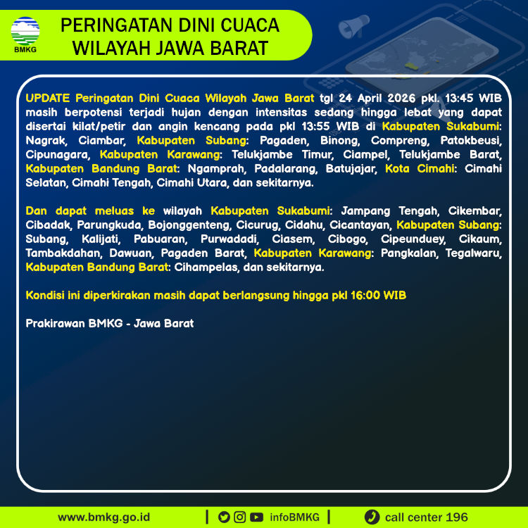 UPDATE Peringatan Dini Cuaca Wilayah Jawa Barat tgl 24 April 2026 pkl. 13:45 WIB berpotensi terjadi hujan dengan intensitas sedang hingga lebat yang dapat disertai kilat/petir dan angin kencang pada pkl 13:55 WIB di