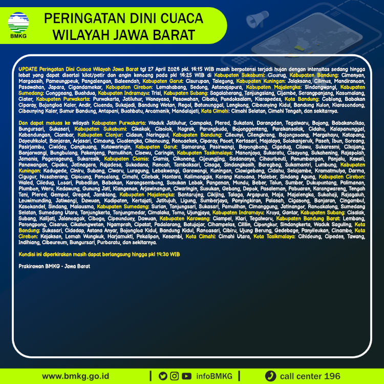 UPDATE Peringatan Dini Cuaca Wilayah Jawa Barat tgl 27 April 2026 pkl. 16:15 WIB berpotensi terjadi hujan dengan intensitas sedang hingga lebat yang dapat disertai kilat/petir dan angin kencang pada pkl 16:25 WIB di