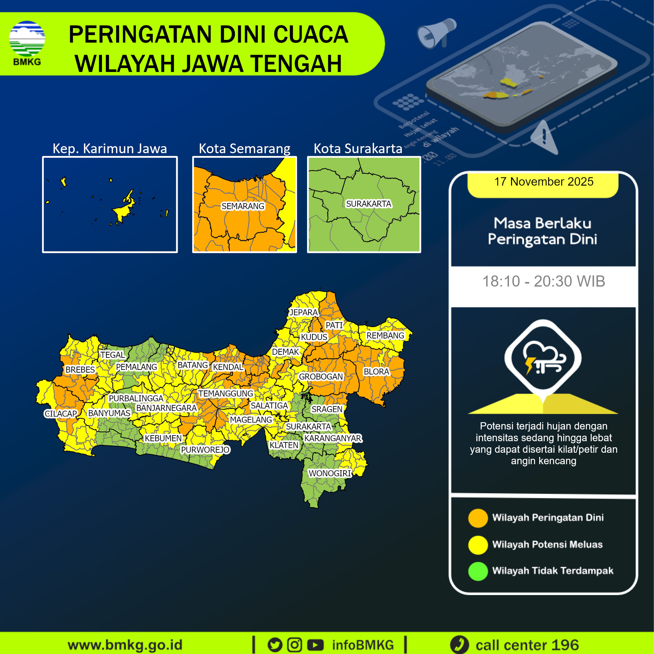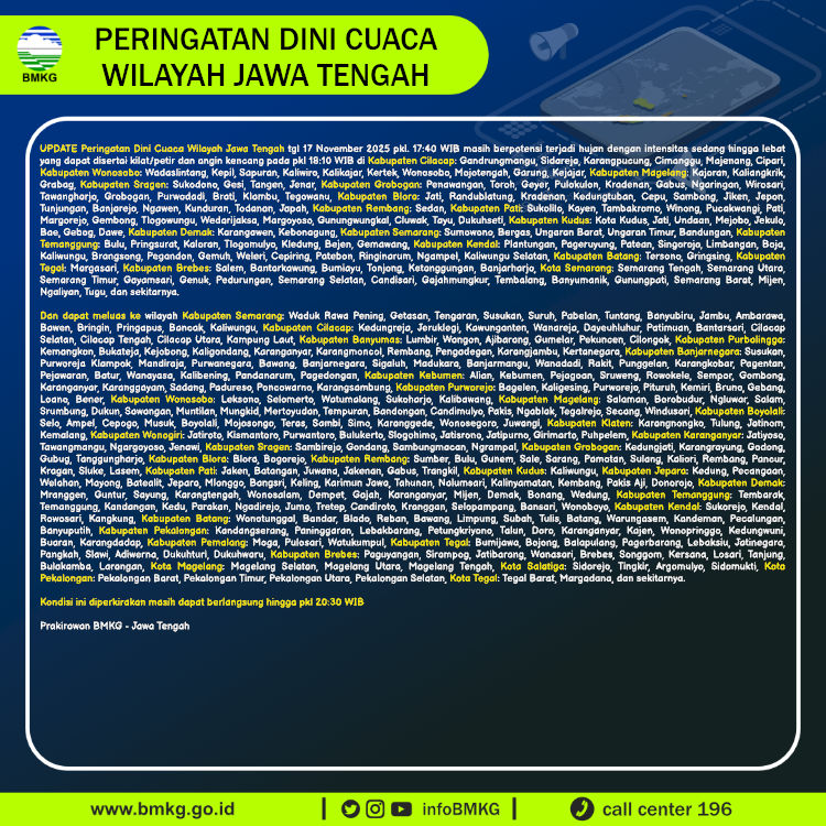 UPDATE Peringatan Dini Cuaca Wilayah Jawa Tengah tgl 17 November 2025 pkl. 17:40 WIB berpotensi terjadi hujan dengan intensitas sedang hingga lebat yang dapat disertai kilat/petir dan angin kencang pada pkl 18:10 WIB di