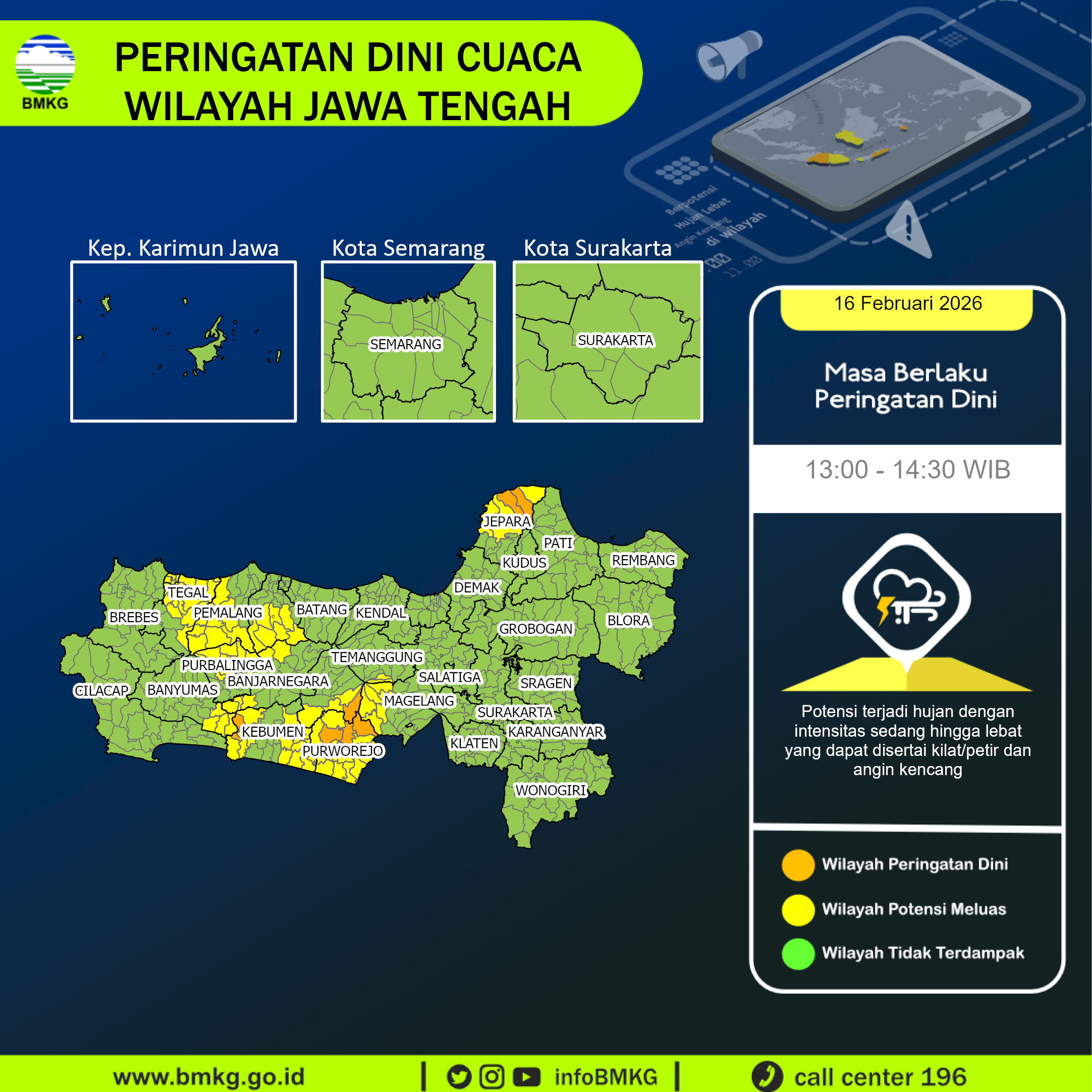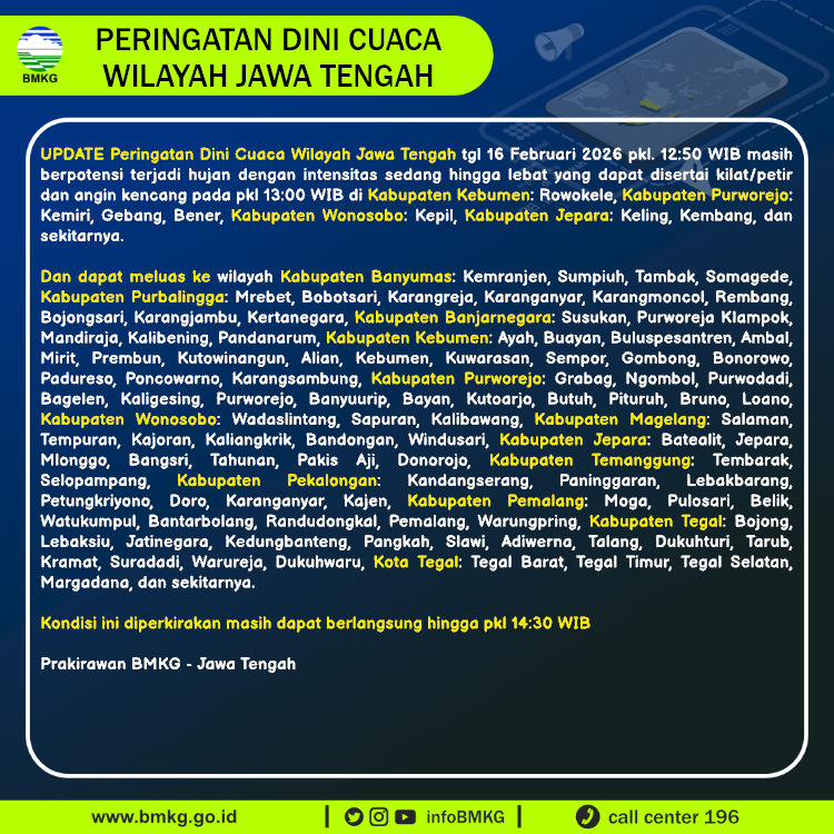 UPDATE Peringatan Dini Cuaca Wilayah Jawa Tengah tgl 16 Februari 2026 pkl. 12:50 WIB berpotensi terjadi hujan dengan intensitas sedang hingga lebat yang dapat disertai kilat/petir dan angin kencang pada pkl 13:00 WIB di