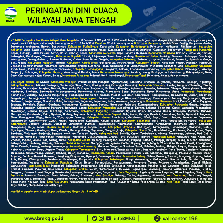 UPDATE Peringatan Dini Cuaca Wilayah Jawa Tengah tgl 18 Februari 2026 pkl. 12:10 WIB berpotensi terjadi hujan dengan intensitas sedang hingga lebat yang dapat disertai kilat/petir dan angin kencang pada pkl 12:20 WIB di