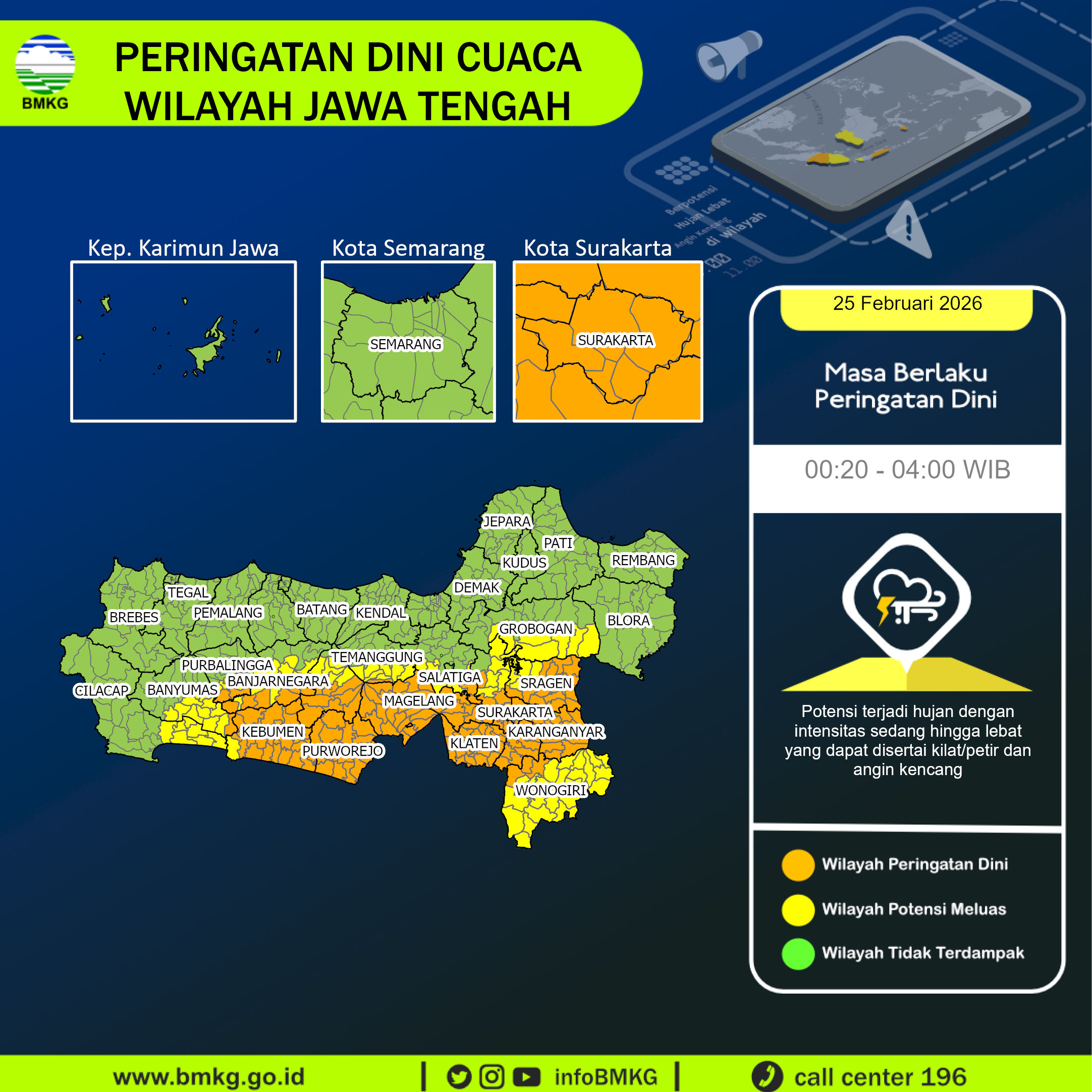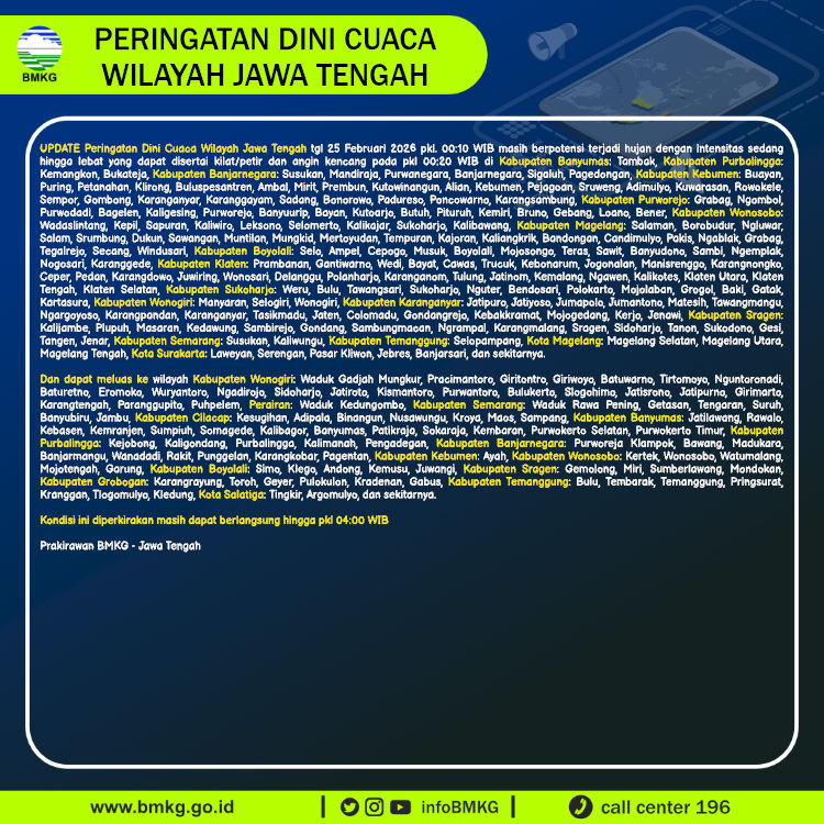 UPDATE Peringatan Dini Cuaca Wilayah Jawa Tengah tgl 25 Februari 2026 pkl. 00:10 WIB berpotensi terjadi hujan dengan intensitas sedang hingga lebat yang dapat disertai kilat/petir dan angin kencang pada pkl 00:20 WIB di