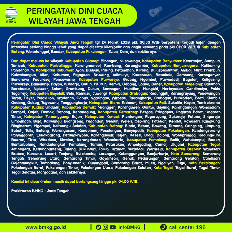 Peringatan Dini Cuaca Wilayah Jawa Tengah tgl 24 Maret 2026 pkl. 00:50 WIB berpotensi terjadi hujan dengan intensitas sedang hingga lebat yang dapat disertai kilat/petir dan angin kencang pada pkl 01:00 WIB di