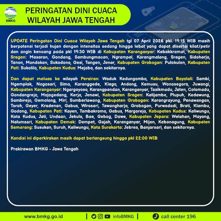 UPDATE Peringatan Dini Cuaca Wilayah Jawa Tengah tgl 07 April 2026 pkl. 19:15 WIB berpotensi terjadi hujan dengan intensitas sedang hingga lebat yang dapat disertai kilat/petir dan angin kencang pada pkl 19:30 WIB di