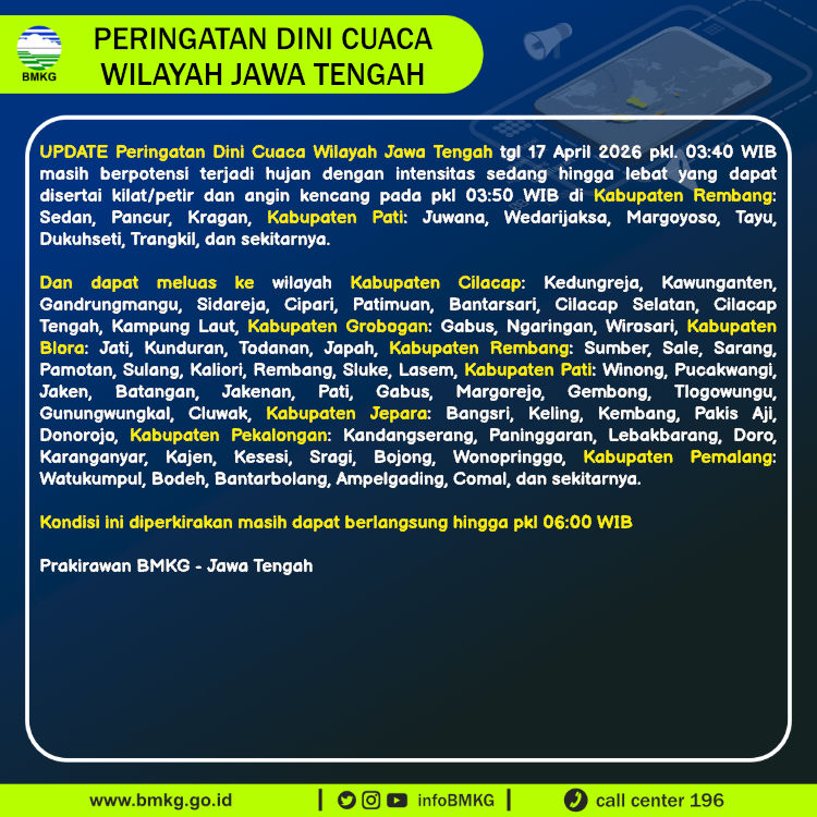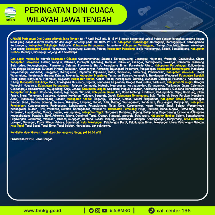 UPDATE Peringatan Dini Cuaca Wilayah Jawa Tengah tgl 17 April 2026 pkl. 18:15 WIB berpotensi terjadi hujan dengan intensitas sedang hingga lebat yang dapat disertai kilat/petir dan angin kencang pada pkl 18:25 WIB di