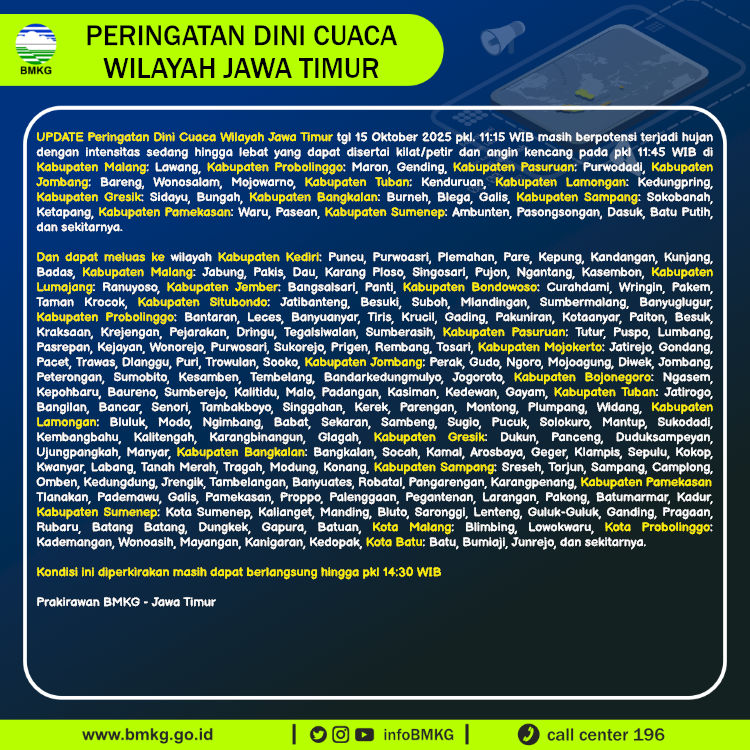 UPDATE Peringatan Dini Cuaca Wilayah Jawa Timur tgl 15 Oktober 2025 pkl. 11:15 WIB berpotensi terjadi hujan dengan intensitas sedang hingga lebat yang dapat disertai kilat/petir dan angin kencang pada pkl 11:45 WIB di