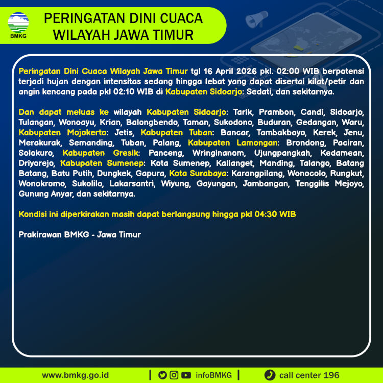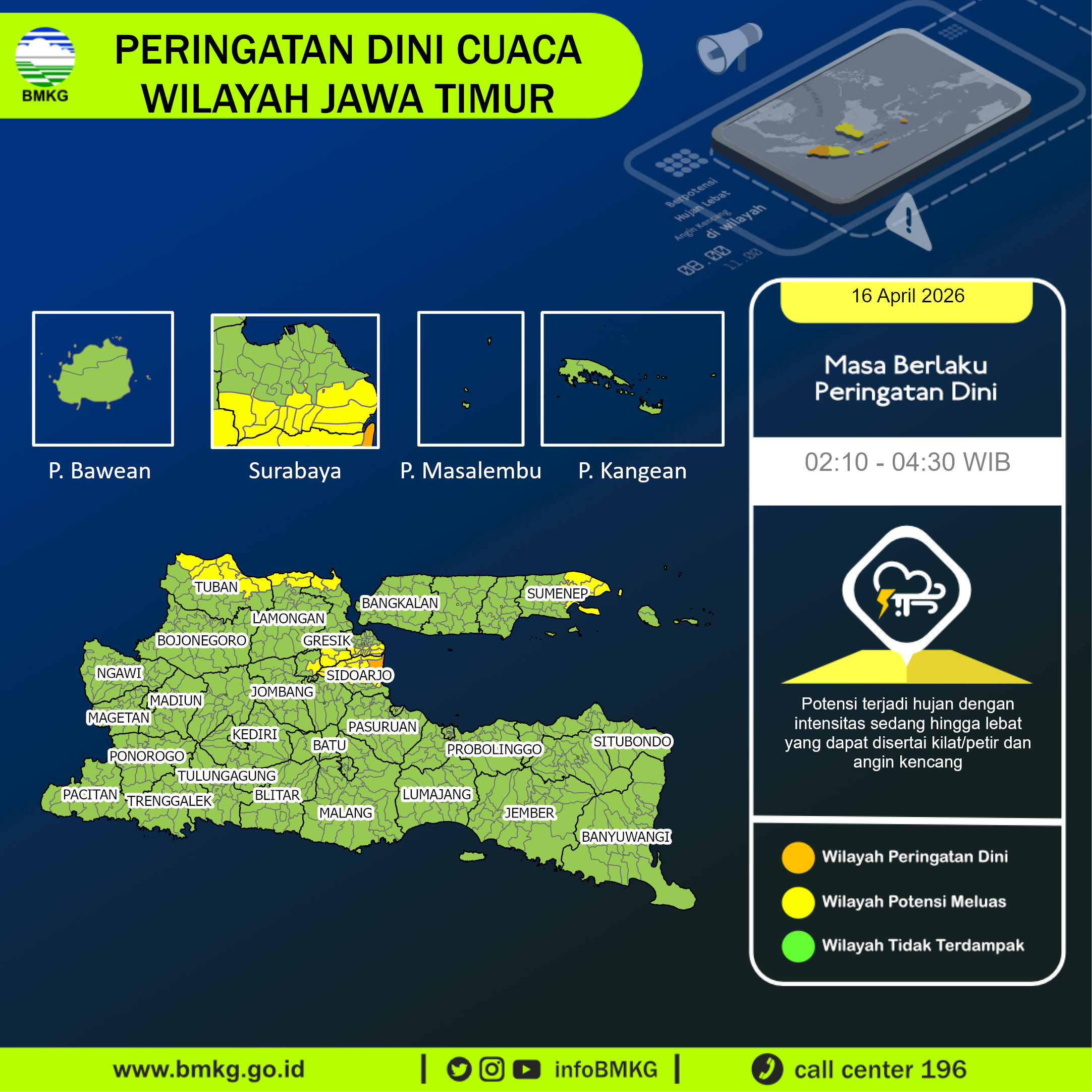 Peringatan Dini Cuaca Wilayah Jawa Timur tgl 16 April 2026 pkl. 02:00 WIB berpotensi terjadi hujan dengan intensitas sedang hingga lebat yang dapat disertai kilat/petir dan angin kencang pada pkl 02:10 WIB di