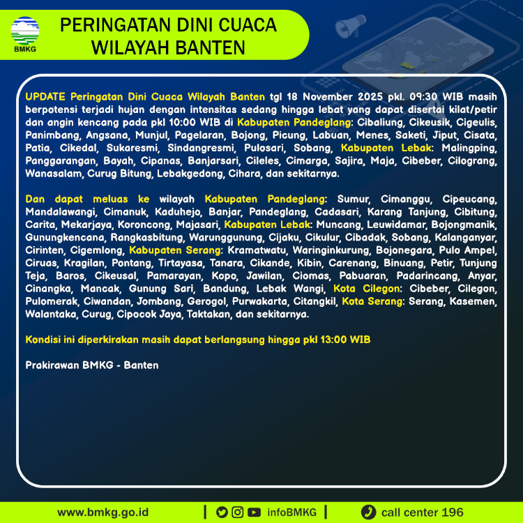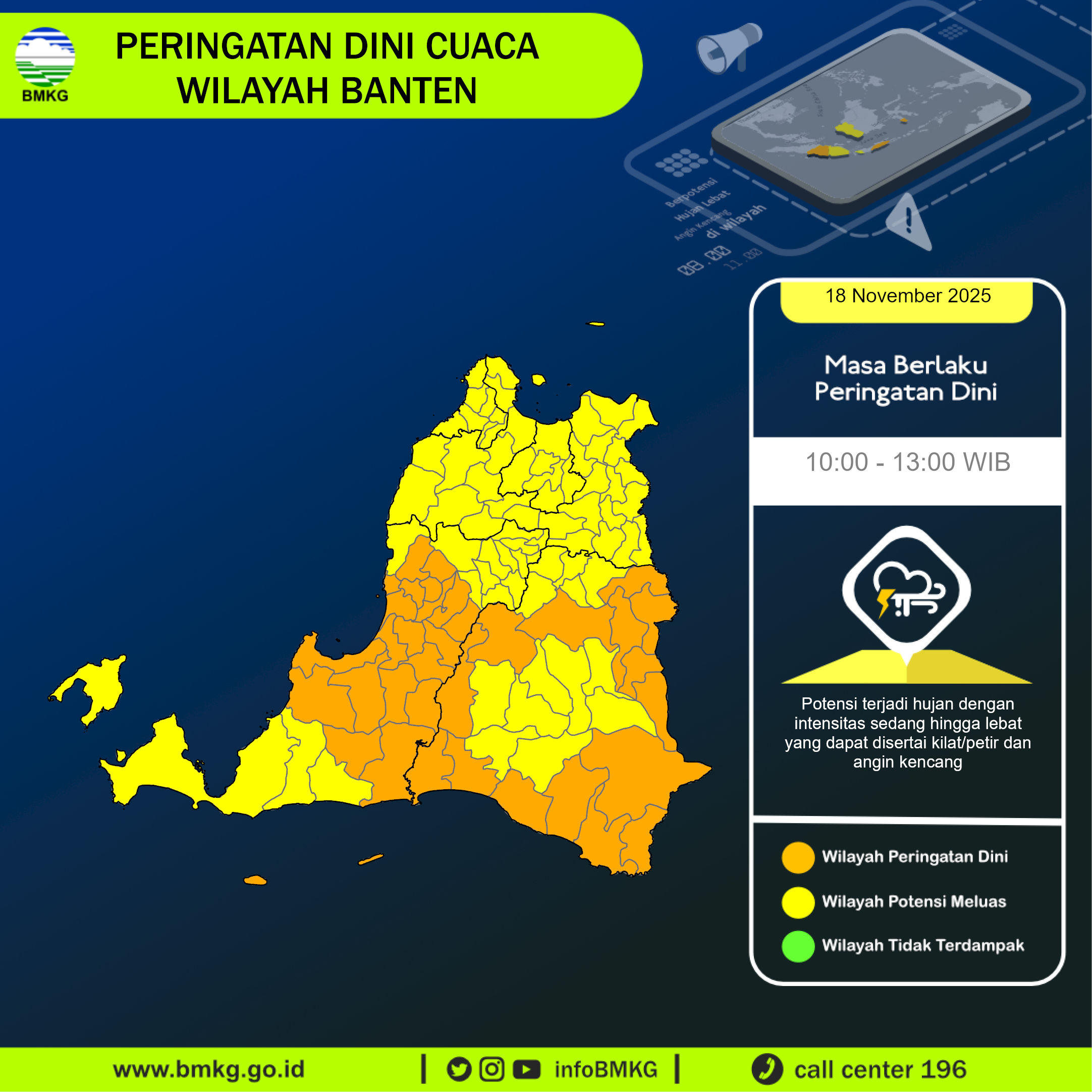 UPDATE Peringatan Dini Cuaca Wilayah Banten tgl 18 November 2025 pkl. 09:30 WIB berpotensi terjadi hujan dengan intensitas sedang hingga lebat yang dapat disertai kilat/petir dan angin kencang pada pkl 10:00 WIB di