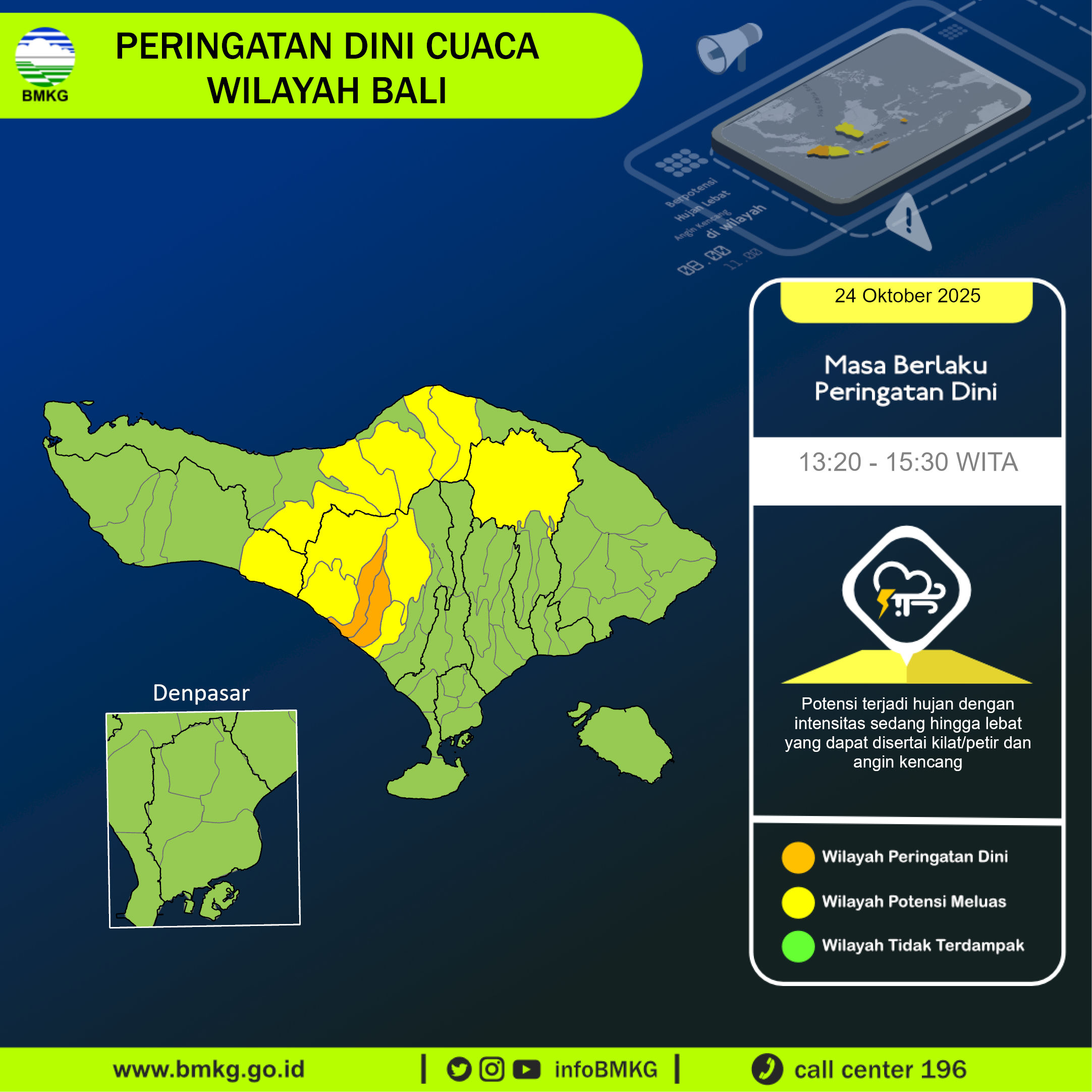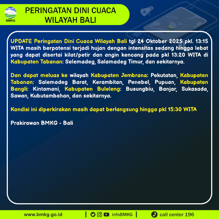 UPDATE Peringatan Dini Cuaca Wilayah Bali tgl 24 Oktober 2025 pkl. 13:15 WITA berpotensi terjadi hujan dengan intensitas sedang hingga lebat yang dapat disertai kilat/petir dan angin kencang pada pkl 13:20 WITA di