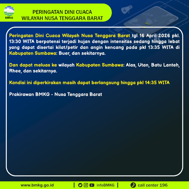 Peringatan Dini Cuaca Wilayah Nusa Tenggara Barat tgl 16 April 2026 pkl. 13:30 WITA berpotensi terjadi hujan dengan intensitas sedang hingga lebat yang dapat disertai kilat/petir dan angin kencang pada pkl 13:35 WITA di