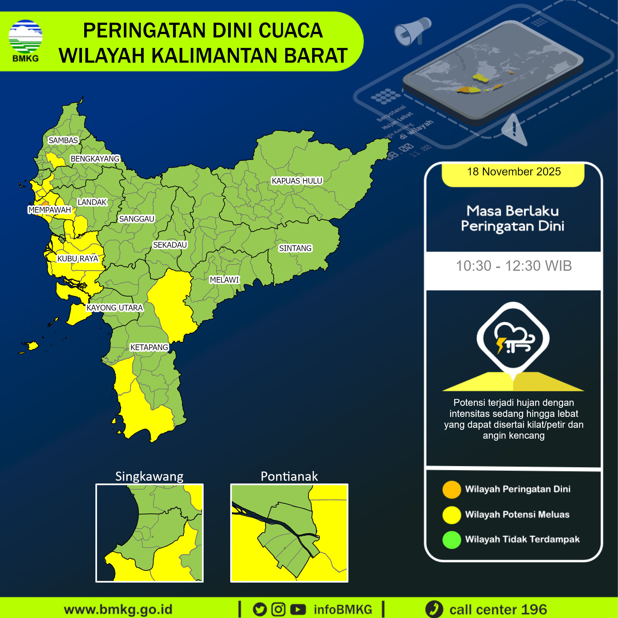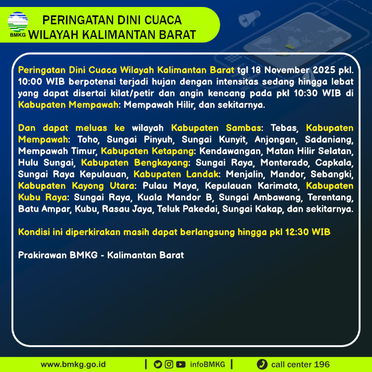 Peringatan Dini Cuaca Wilayah Kalimantan Barat tgl 18 November 2025 pkl. 10:00 WIB berpotensi terjadi hujan dengan intensitas sedang hingga lebat yang dapat disertai kilat/petir dan angin kencang pada pkl 10:30 WIB di