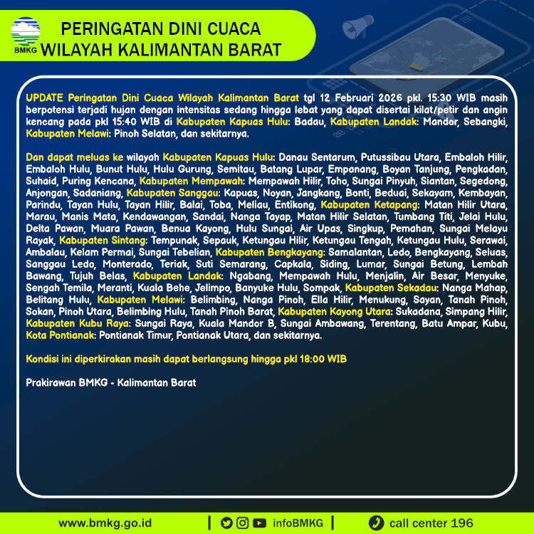 UPDATE Peringatan Dini Cuaca Wilayah Kalimantan Barat tgl 12 Februari 2026 pkl. 15:30 WIB berpotensi terjadi hujan dengan intensitas sedang hingga lebat yang dapat disertai kilat/petir dan angin kencang pada pkl 15:40 WIB di