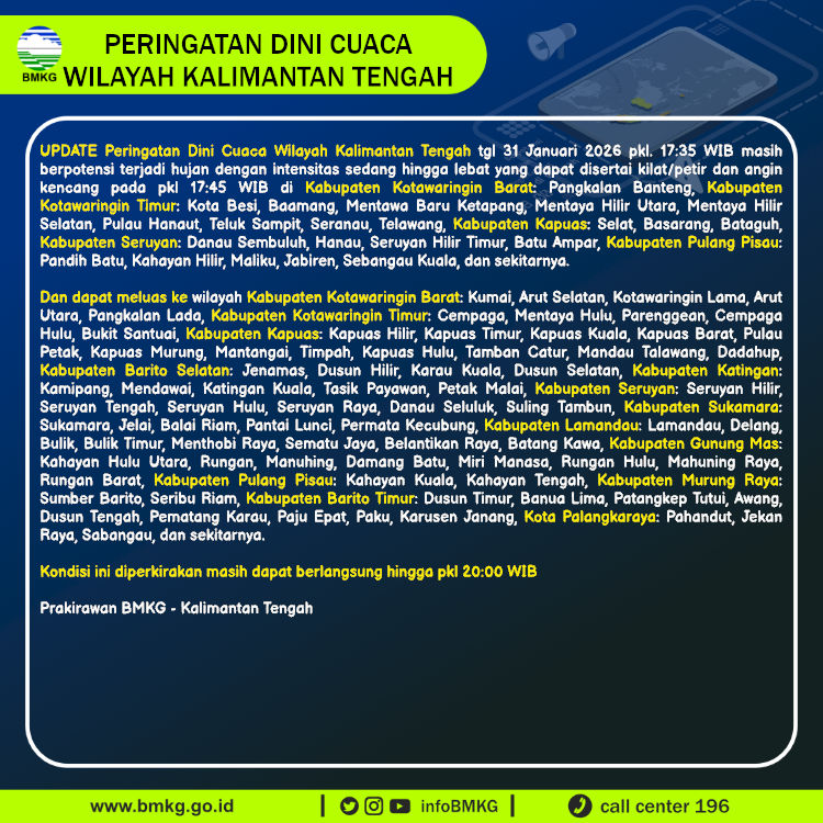 UPDATE Peringatan Dini Cuaca Wilayah Kalimantan Tengah tgl 31 Januari 2026 pkl. 17:35 WIB berpotensi terjadi hujan dengan intensitas sedang hingga lebat yang dapat disertai kilat/petir dan angin kencang pada pkl 17:45 WIB di
