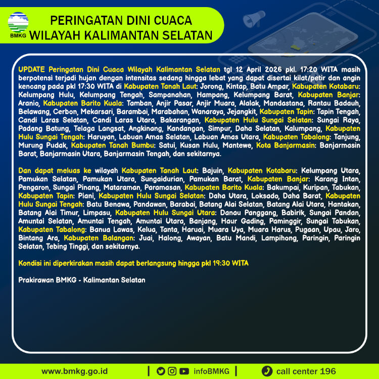 UPDATE Peringatan Dini Cuaca Wilayah Kalimantan Selatan tgl 12 April 2026 pkl. 17:20 WITA berpotensi terjadi hujan dengan intensitas sedang hingga lebat yang dapat disertai kilat/petir dan angin kencang pada pkl 17:30 WITA di