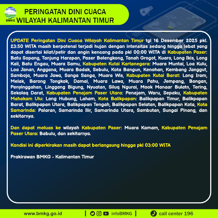 UPDATE Peringatan Dini Cuaca Wilayah Kalimantan Timur tgl 16 Desember 2025 pkl. 23:50 WITA berpotensi terjadi hujan dengan intensitas sedang hingga lebat yang dapat disertai kilat/petir dan angin kencang pada pkl 00:00 WITA di