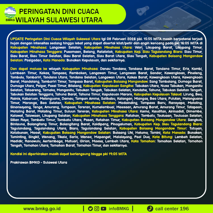 UPDATE Peringatan Dini Cuaca Wilayah Sulawesi Utara tgl 08 Februari 2026 pkl. 15:55 WITA berpotensi terjadi hujan dengan intensitas sedang hingga lebat yang dapat disertai kilat/petir dan angin kencang pada pkl 16:05 WITA di