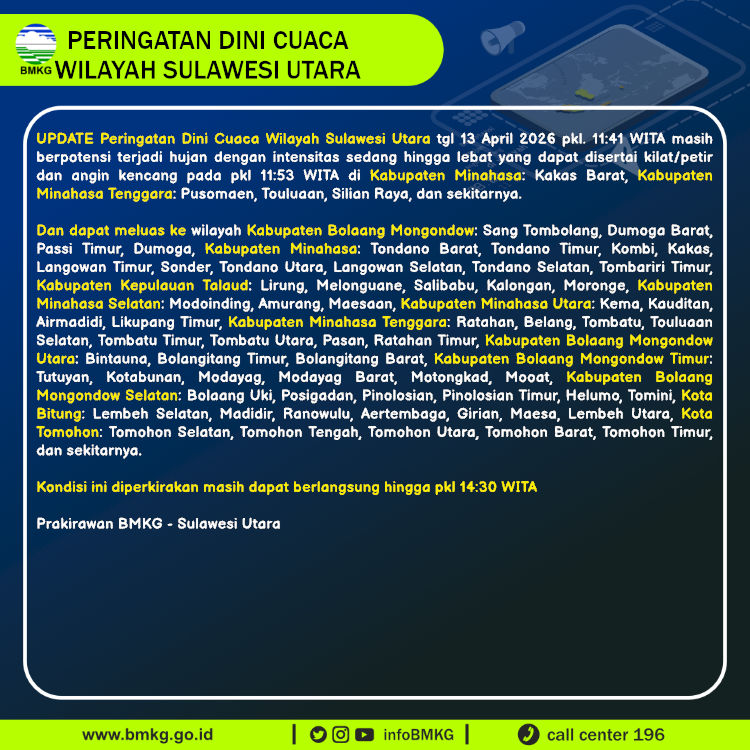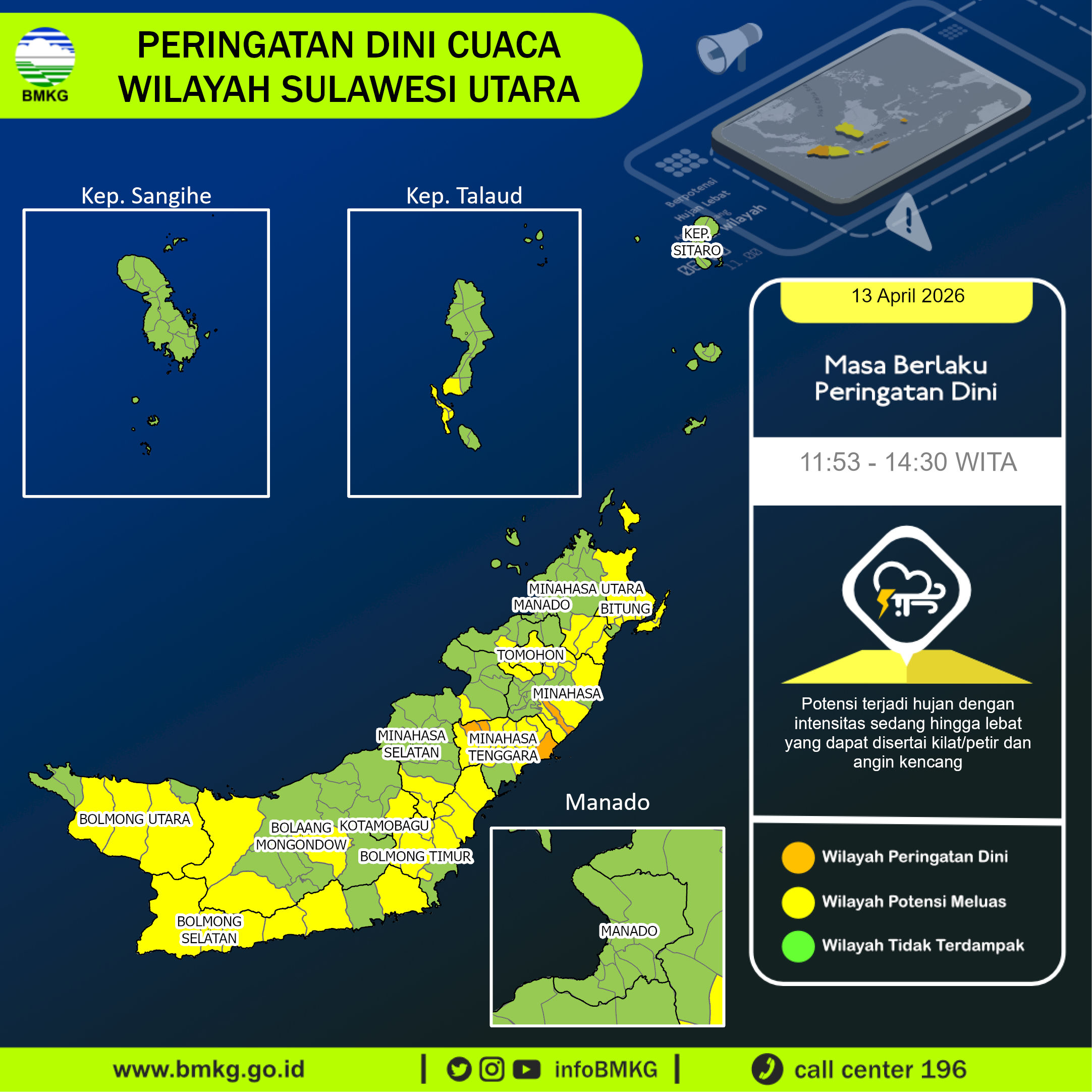 UPDATE Peringatan Dini Cuaca Wilayah Sulawesi Utara tgl 13 April 2026 pkl. 11:41 WITA berpotensi terjadi hujan dengan intensitas sedang hingga lebat yang dapat disertai kilat/petir dan angin kencang pada pkl 11:53 WITA di