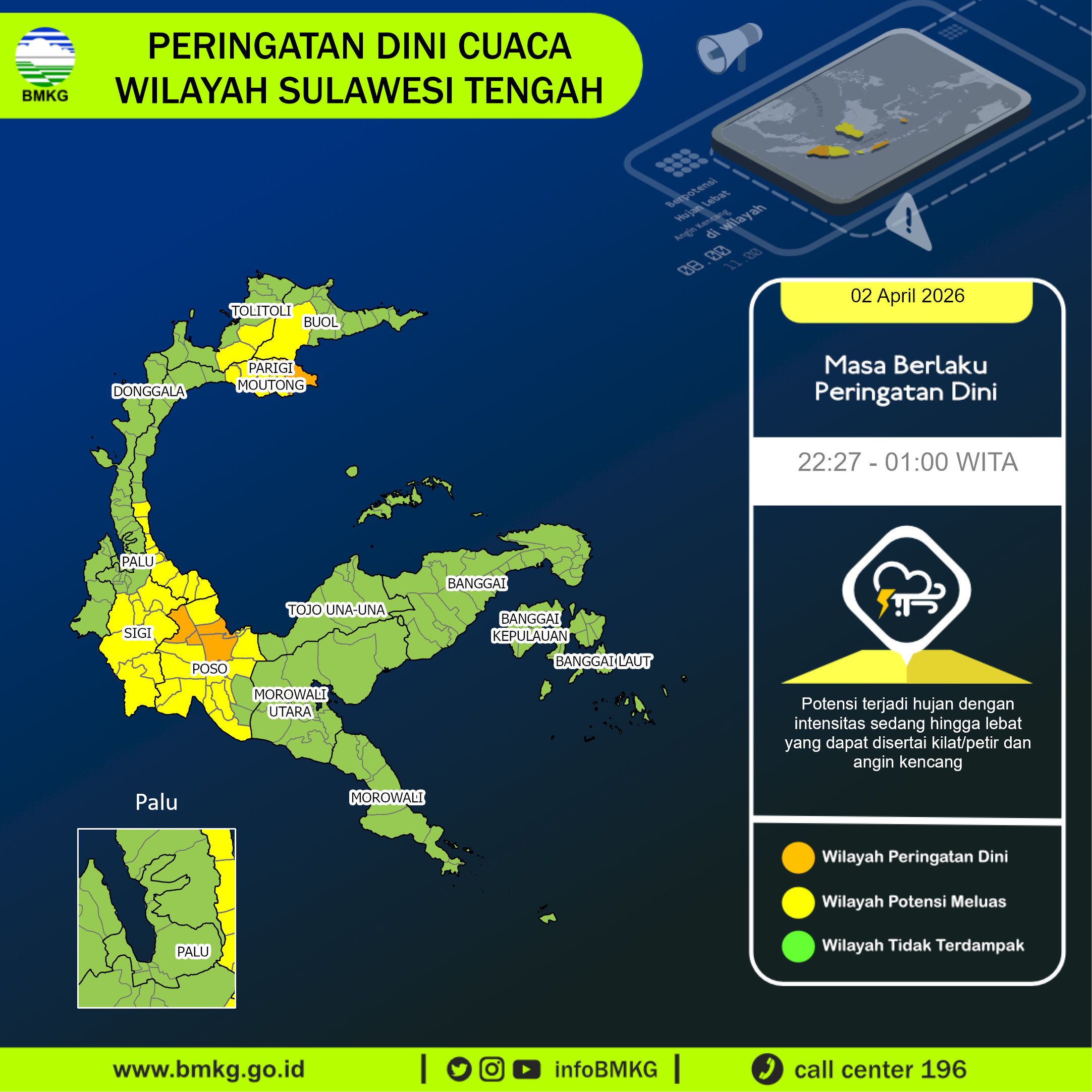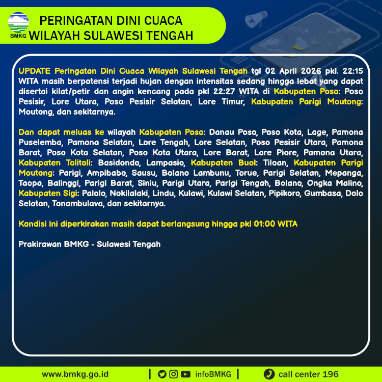 UPDATE Peringatan Dini Cuaca Wilayah Sulawesi Tengah tgl 02 April 2026 pkl. 22:15 WITA berpotensi terjadi hujan dengan intensitas sedang hingga lebat yang dapat disertai kilat/petir dan angin kencang pada pkl 22:27 WITA di