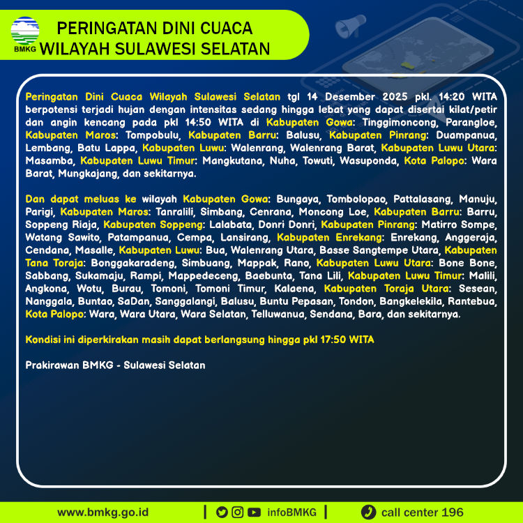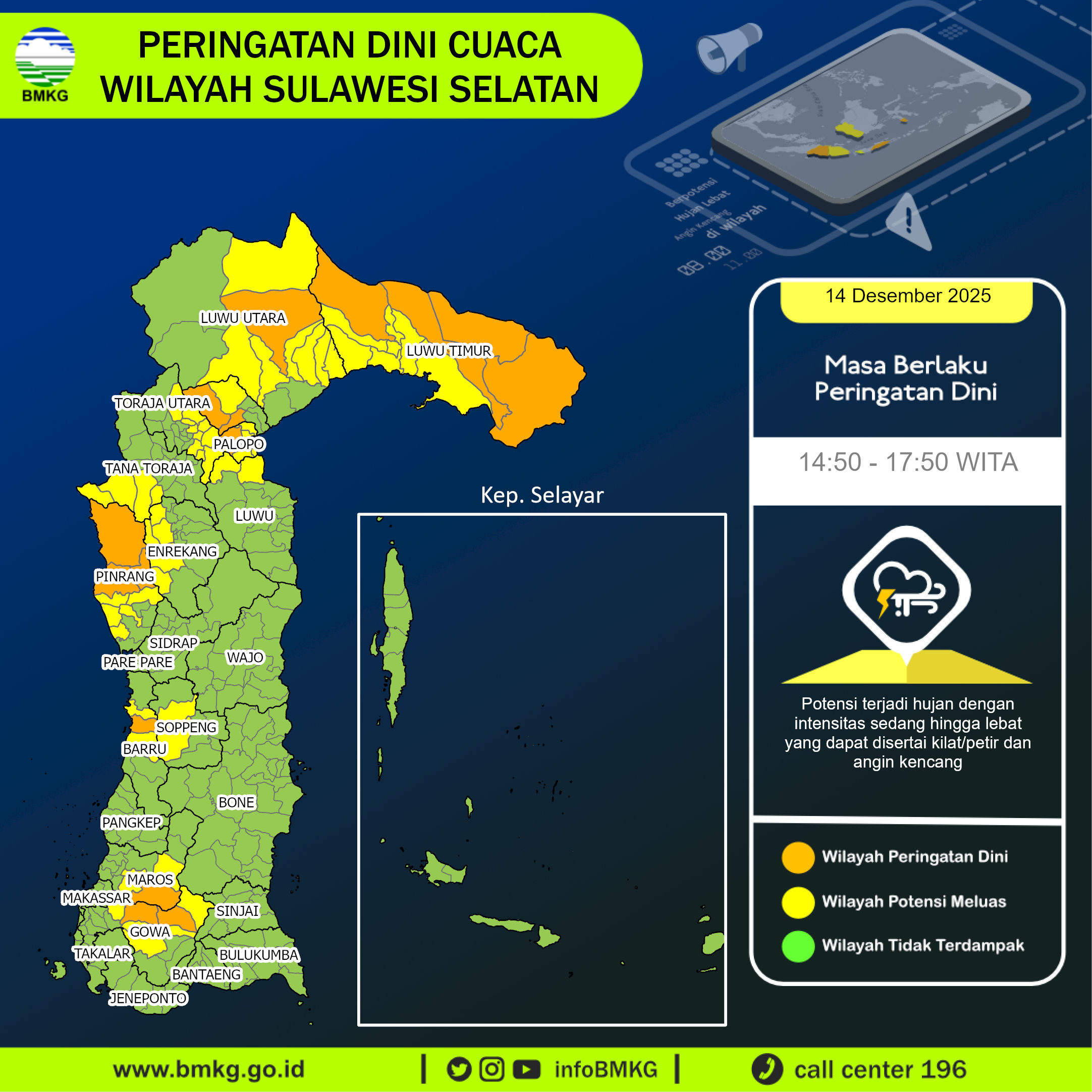 Peringatan Dini Cuaca Wilayah Sulawesi Selatan tgl 14 Desember 2025 pkl. 14:20 WITA berpotensi terjadi hujan dengan intensitas sedang hingga lebat yang dapat disertai kilat/petir dan angin kencang pada pkl 14:50 WITA di