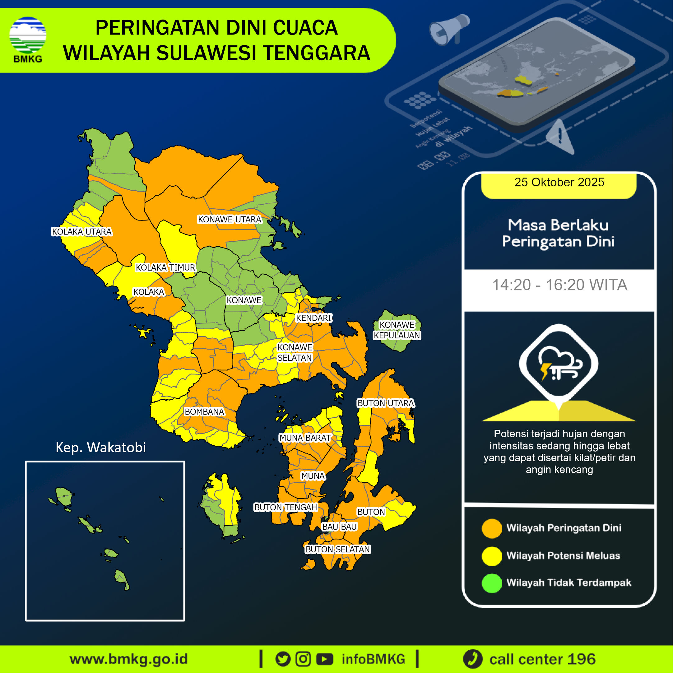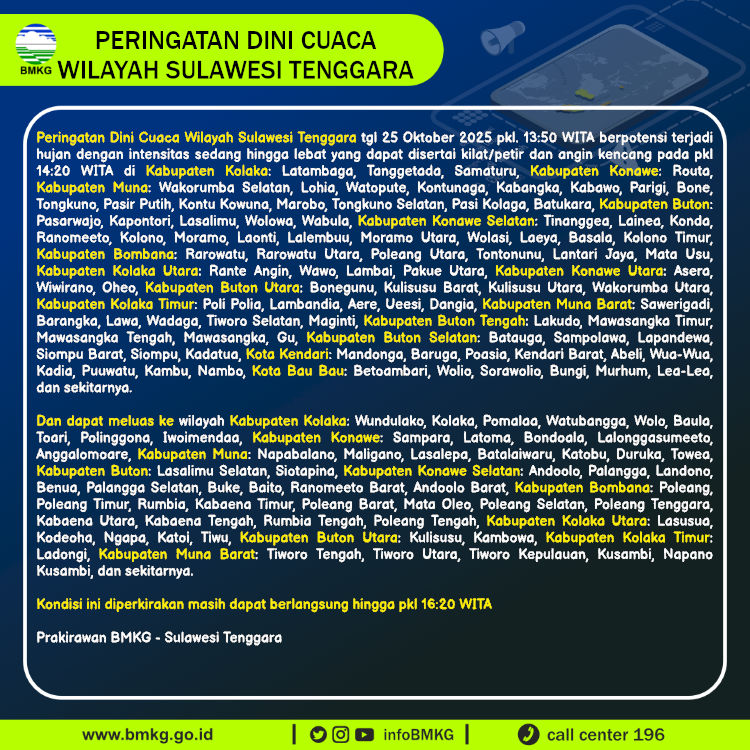 Peringatan Dini Cuaca Wilayah Sulawesi Tenggara tgl 25 Oktober 2025 pkl. 13:50 WITA berpotensi terjadi hujan dengan intensitas sedang hingga lebat yang dapat disertai kilat/petir dan angin kencang pada pkl 14:20 WITA di