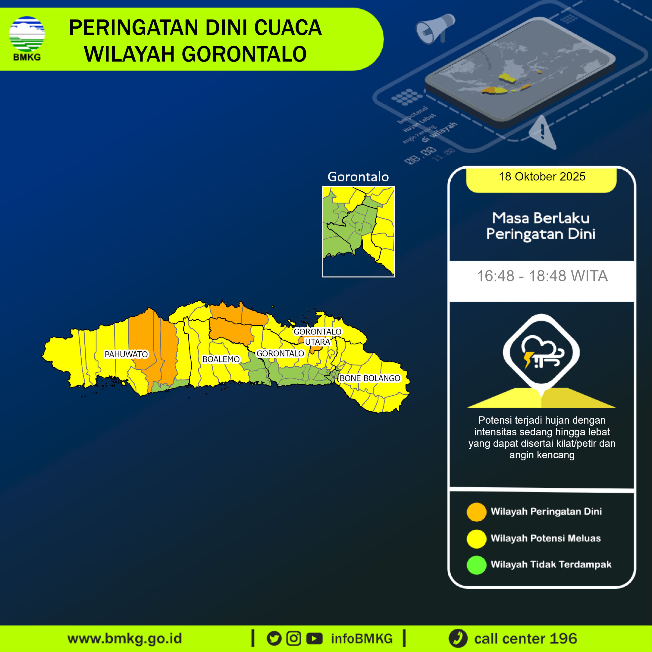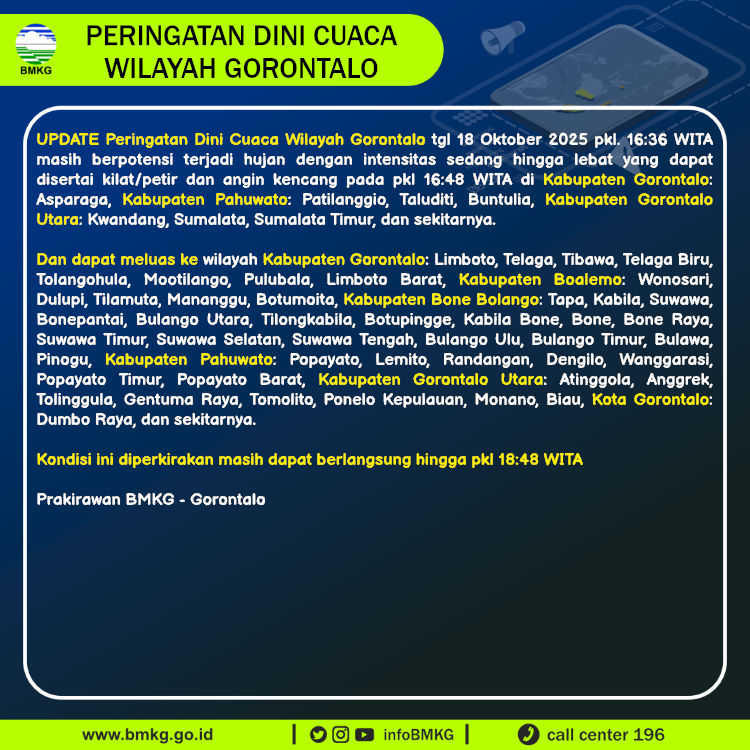 UPDATE Peringatan Dini Cuaca Wilayah Gorontalo tgl 18 Oktober 2025 pkl. 16:36 WITA berpotensi terjadi hujan dengan intensitas sedang hingga lebat yang dapat disertai kilat/petir dan angin kencang pada pkl 16:48 WITA di