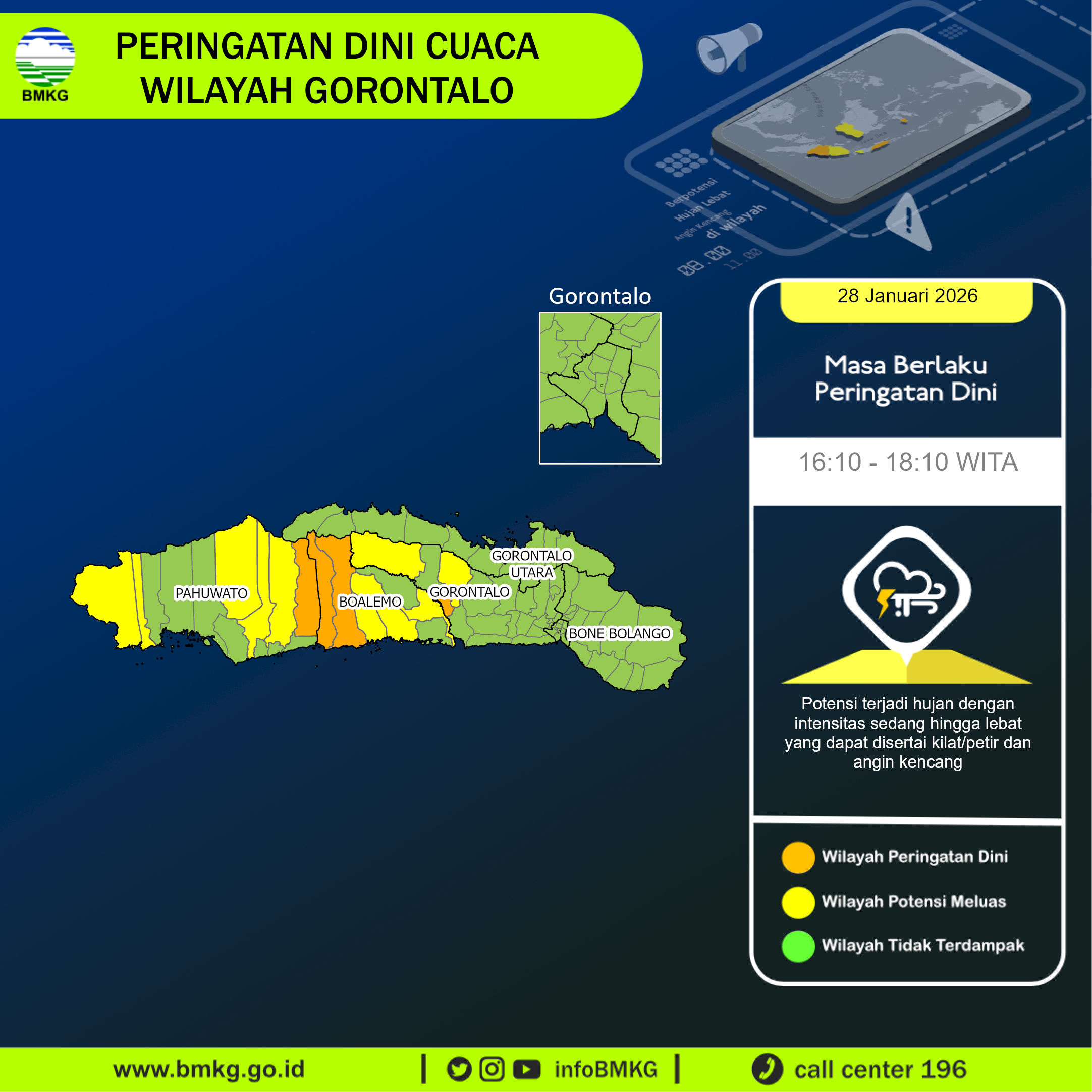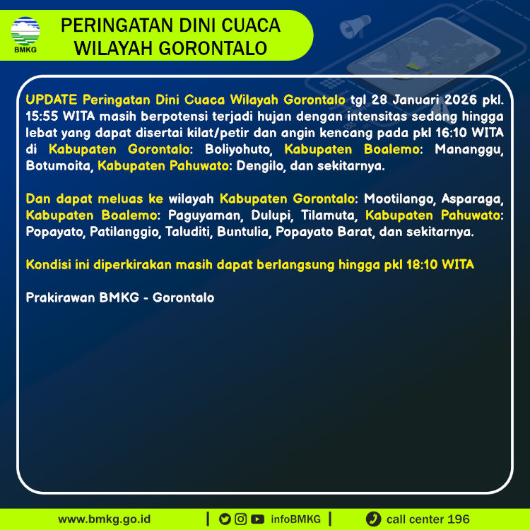 UPDATE Peringatan Dini Cuaca Wilayah Gorontalo tgl 28 Januari 2026 pkl. 15:55 WITA berpotensi terjadi hujan dengan intensitas sedang hingga lebat yang dapat disertai kilat/petir dan angin kencang pada pkl 16:10 WITA di