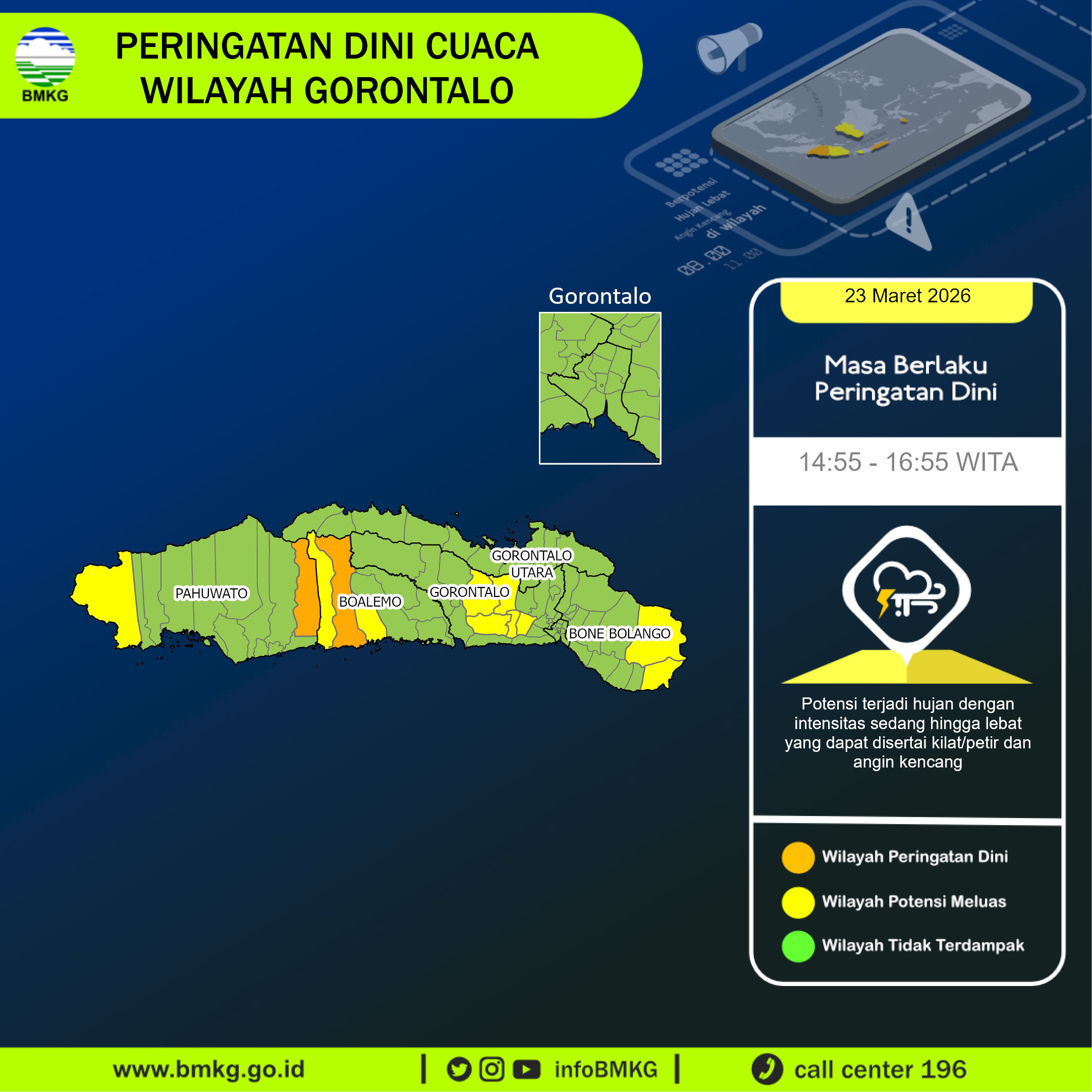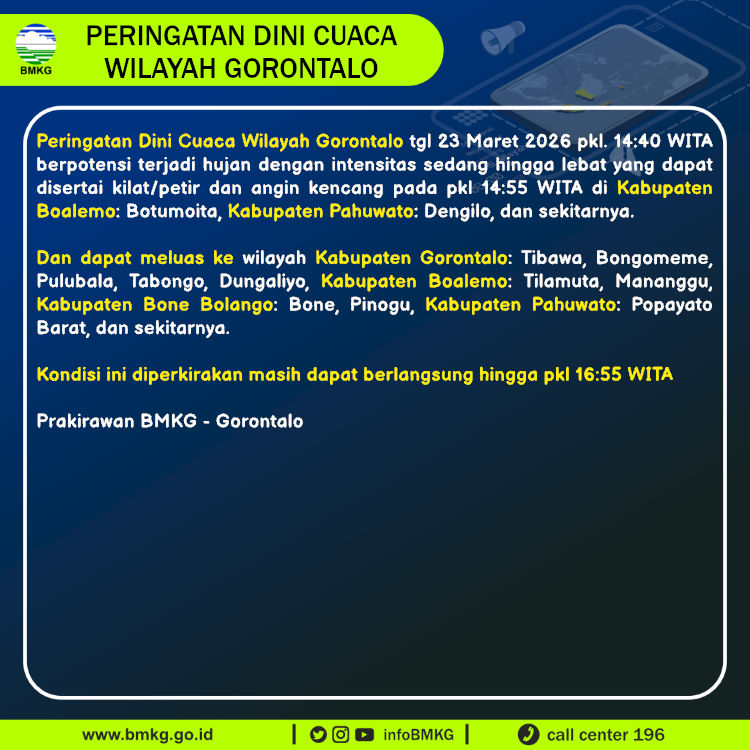 Peringatan Dini Cuaca Wilayah Gorontalo tgl 23 Maret 2026 pkl. 14:40 WITA berpotensi terjadi hujan dengan intensitas sedang hingga lebat yang dapat disertai kilat/petir dan angin kencang pada pkl 14:55 WITA di
