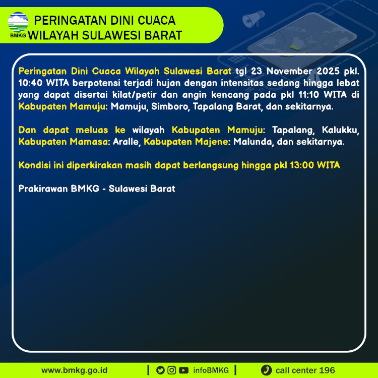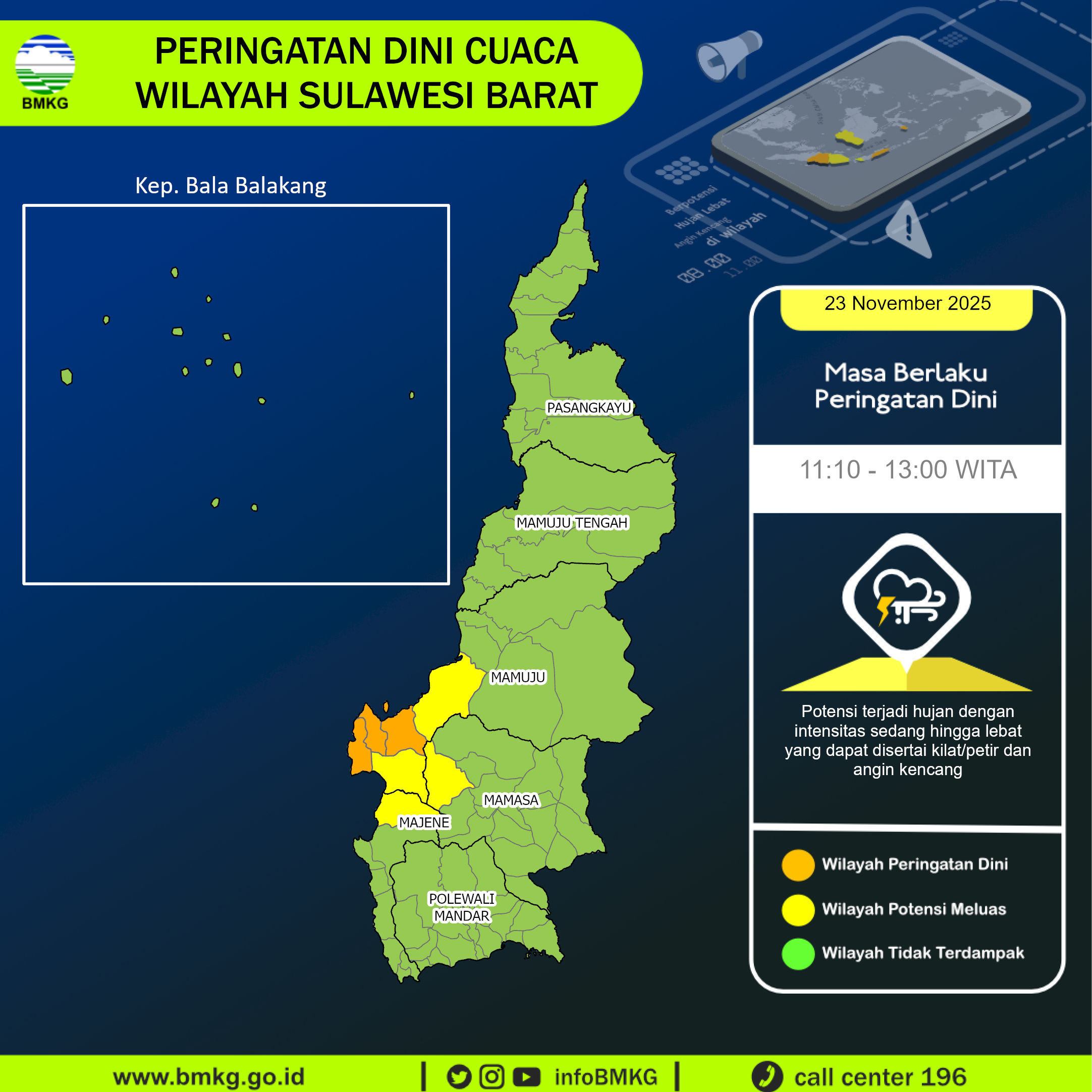 Peringatan Dini Cuaca Wilayah Sulawesi Barat tgl 23 November 2025 pkl. 10:40 WITA berpotensi terjadi hujan dengan intensitas sedang hingga lebat yang dapat disertai kilat/petir dan angin kencang pada pkl 11:10 WITA di