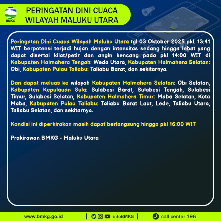 Peringatan Dini Cuaca Wilayah Maluku Utara tgl 03 Oktober 2025 pkl. 13:41 WIT berpotensi terjadi hujan dengan intensitas sedang hingga lebat yang dapat disertai kilat/petir dan angin kencang pada pkl 14:00 WIT di