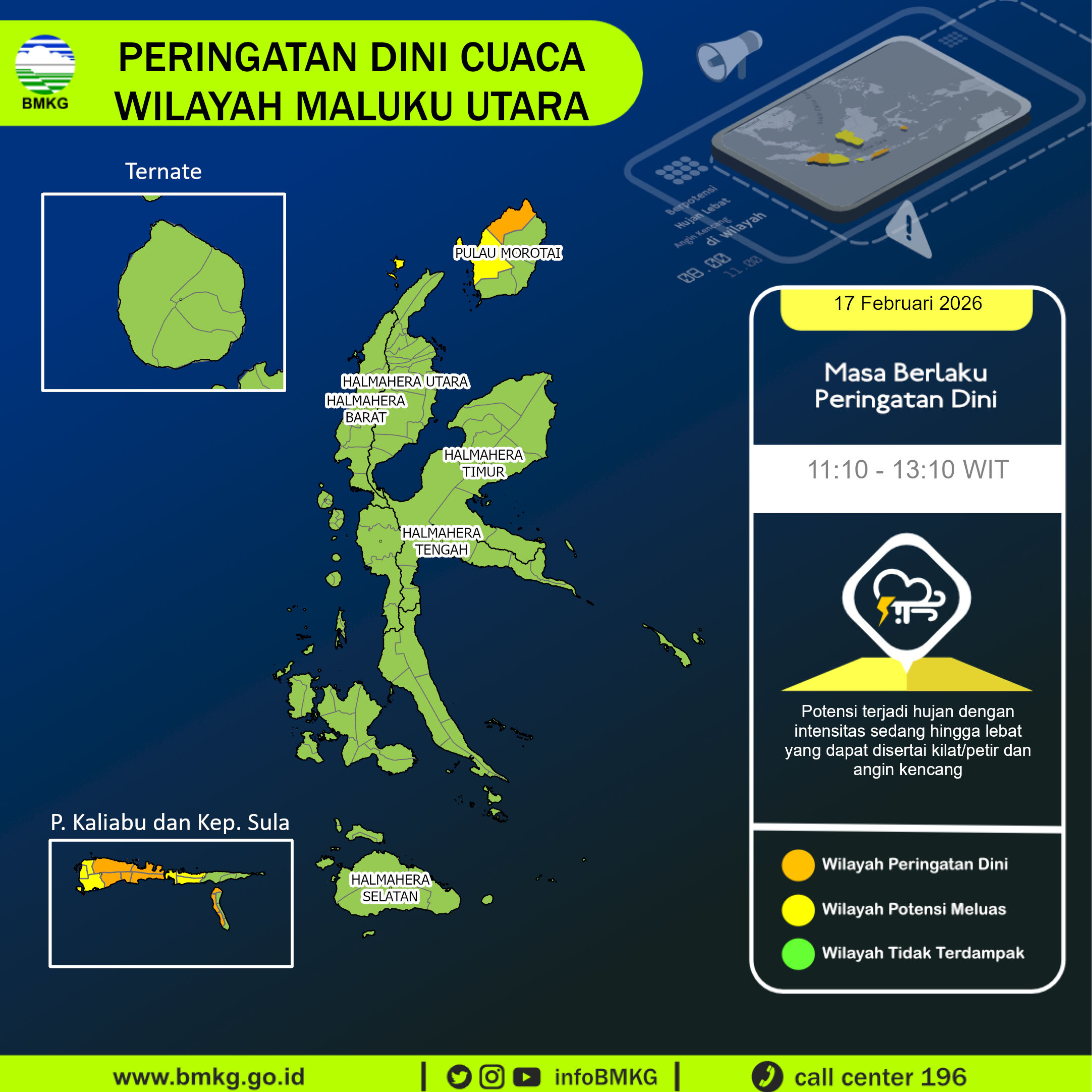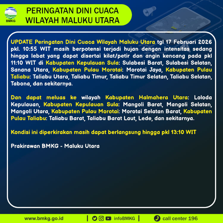 UPDATE Peringatan Dini Cuaca Wilayah Maluku Utara tgl 17 Februari 2026 pkl. 10:55 WIT berpotensi terjadi hujan dengan intensitas sedang hingga lebat yang dapat disertai kilat/petir dan angin kencang pada pkl 11:10 WIT di