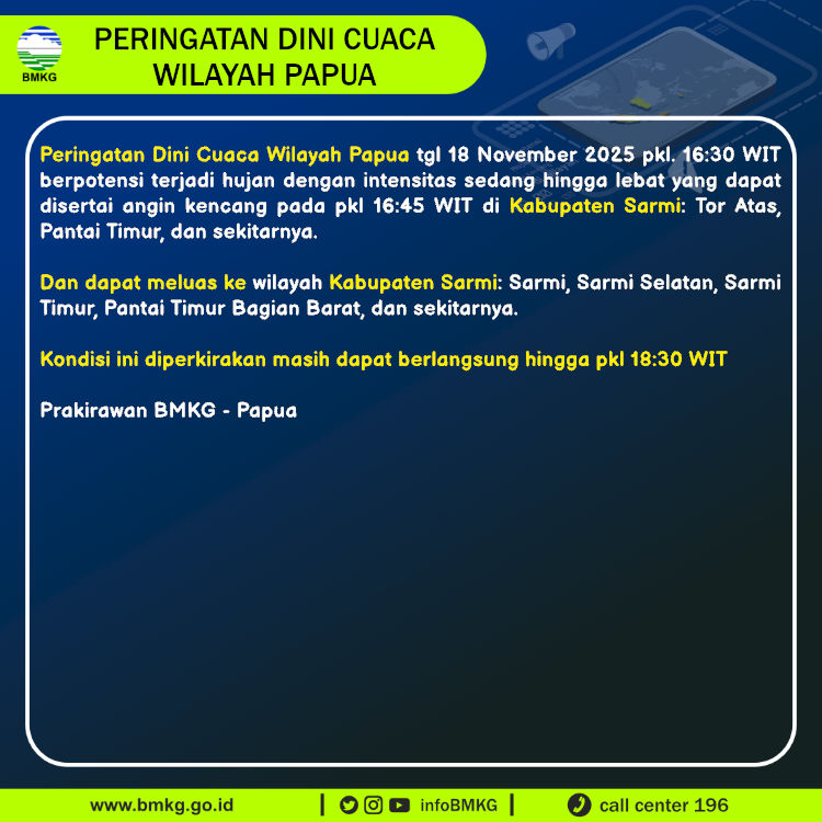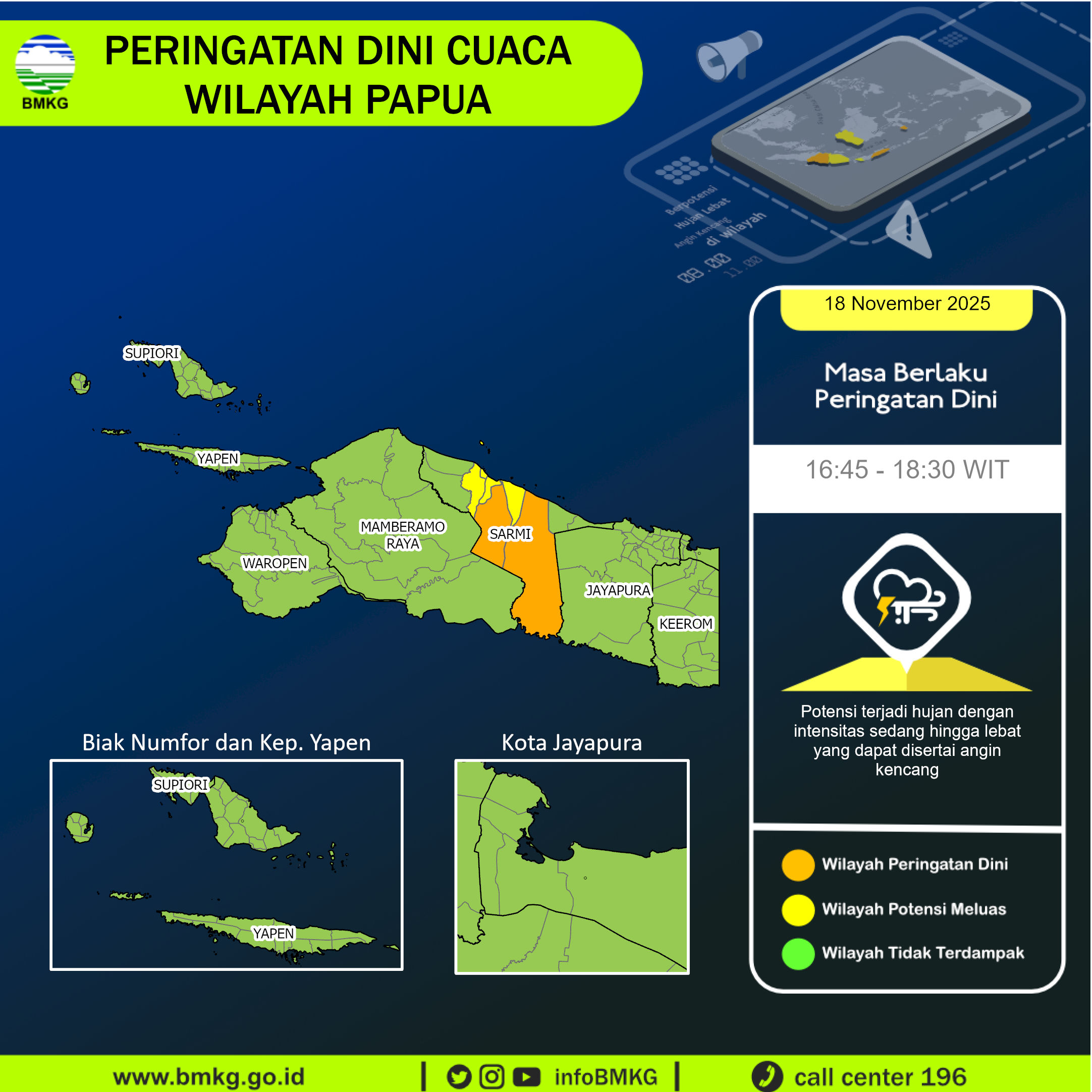 Peringatan Dini Cuaca Wilayah Papua tgl 18 November 2025 pkl. 16:30 WIT berpotensi terjadi hujan dengan intensitas sedang hingga lebat yang dapat disertai angin kencang pada pkl 16:45 WIT di