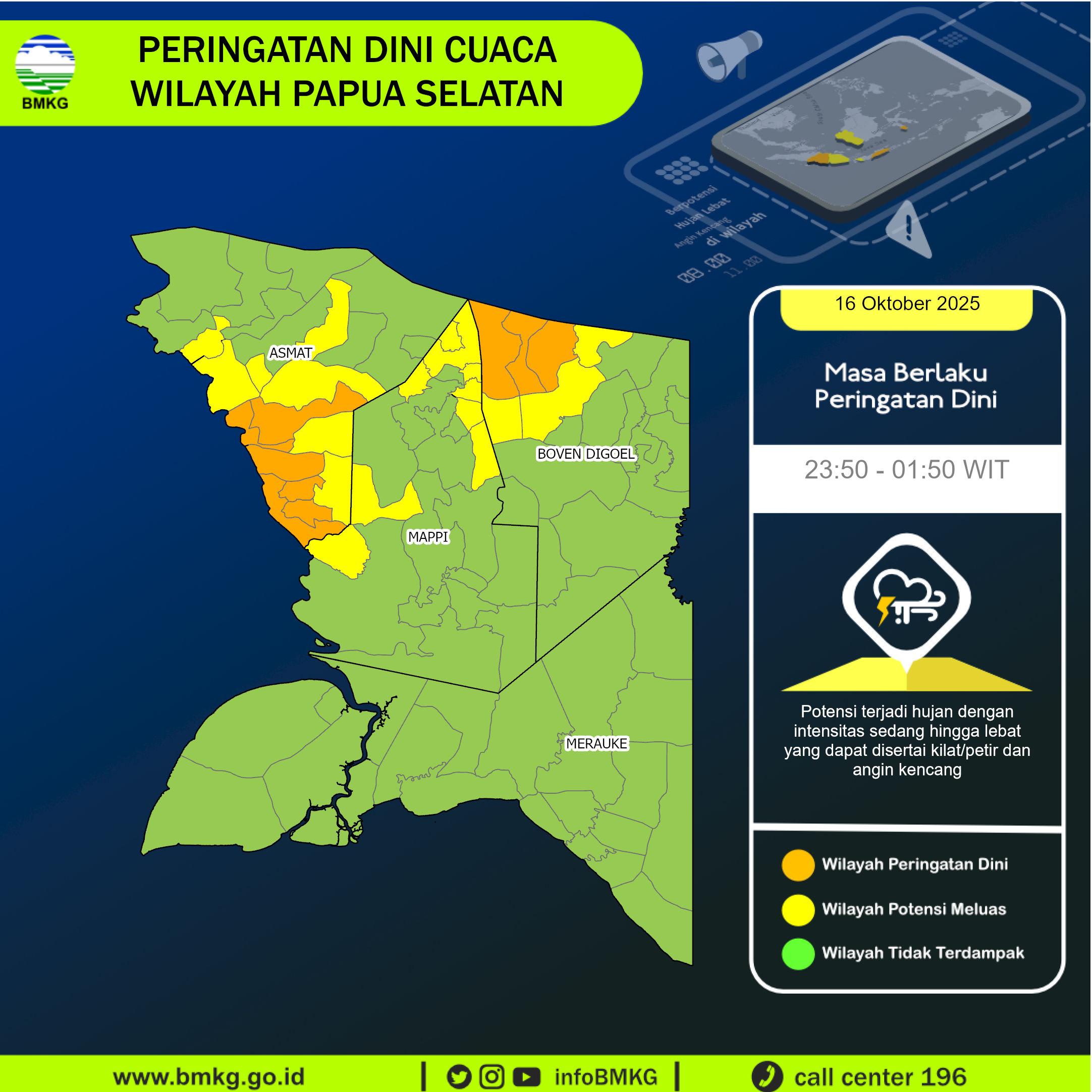 Peringatan Dini Cuaca Wilayah Papua Selatan tgl 16 Oktober 2025 pkl. 23:40 WIT berpotensi terjadi hujan dengan intensitas sedang hingga lebat yang dapat disertai kilat/petir dan angin kencang pada pkl 23:50 WIT di