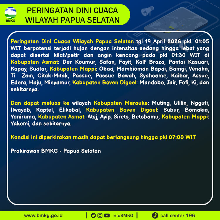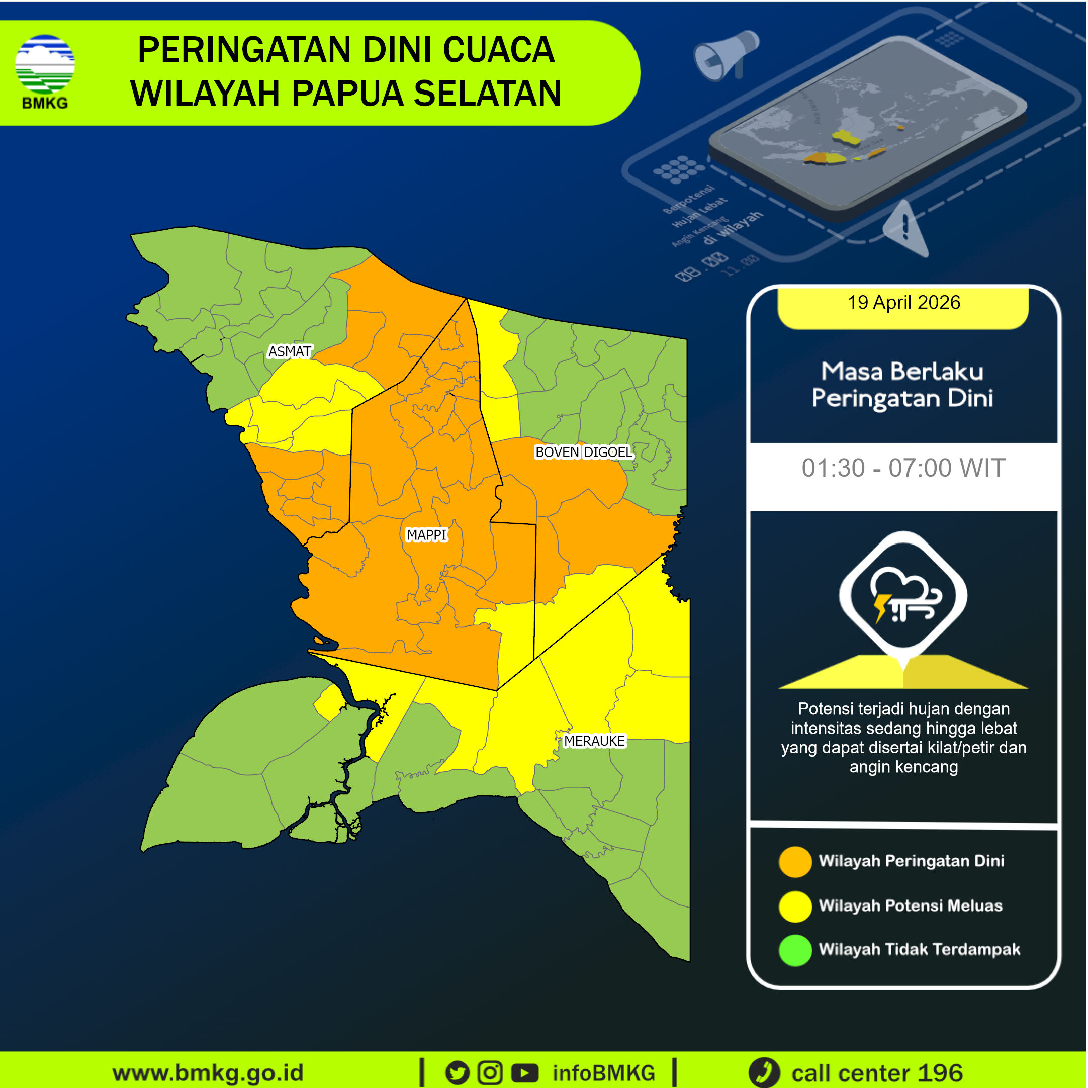 Peringatan Dini Cuaca Wilayah Papua Selatan tgl 19 April 2026 pkl. 01:05 WIT berpotensi terjadi hujan dengan intensitas sedang hingga lebat yang dapat disertai kilat/petir dan angin kencang pada pkl 01:30 WIT di
