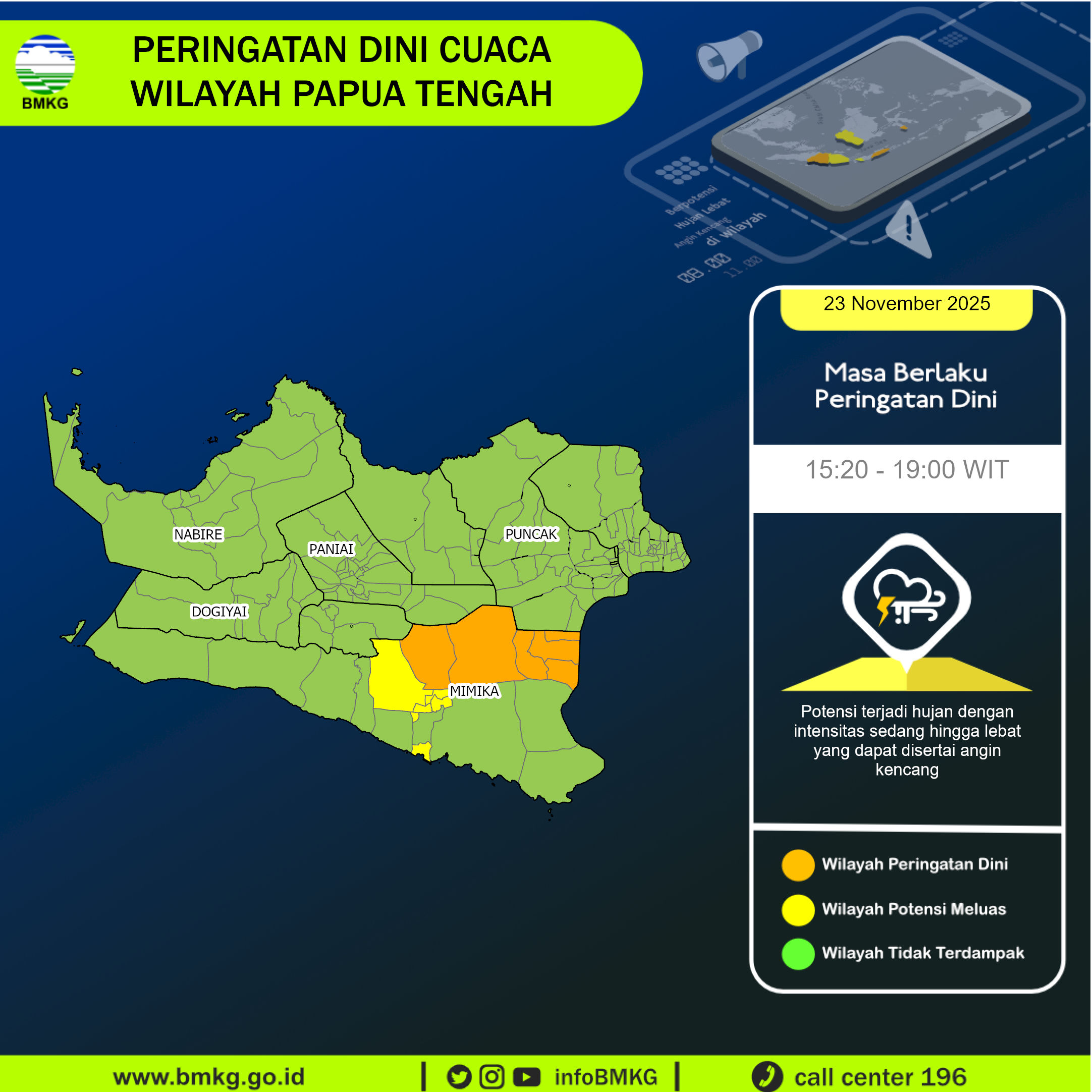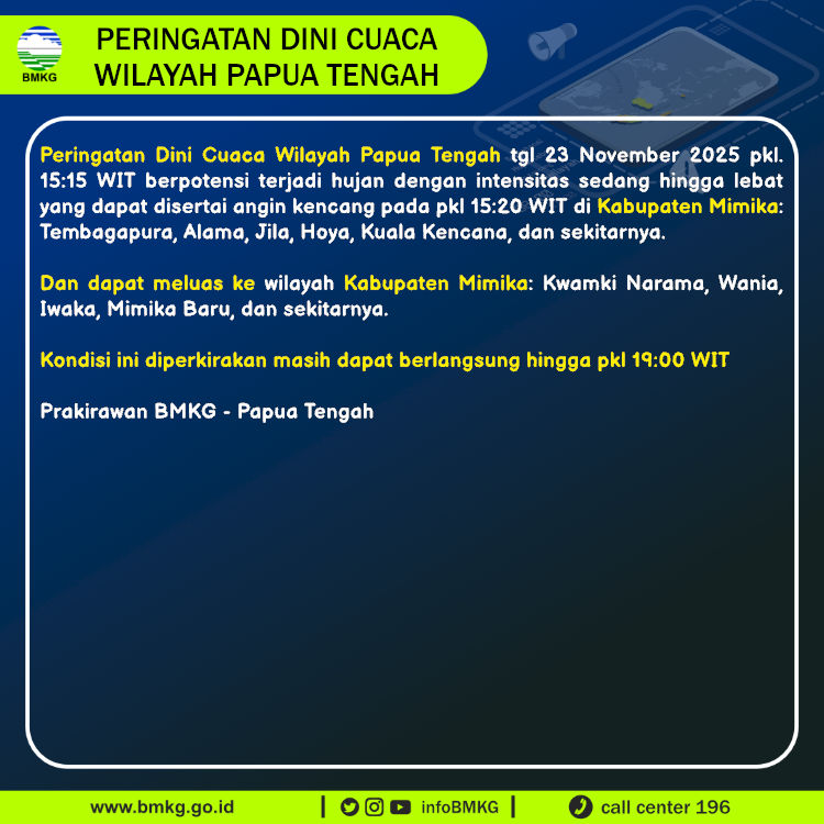 Peringatan Dini Cuaca Wilayah Papua Tengah tgl 23 November 2025 pkl. 15:15 WIT berpotensi terjadi hujan dengan intensitas sedang hingga lebat yang dapat disertai angin kencang pada pkl 15:20 WIT di