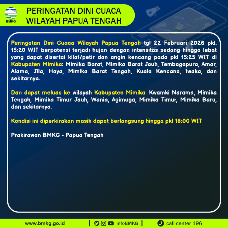 Peringatan Dini Cuaca Wilayah Papua Tengah tgl 22 Februari 2026 pkl. 15:20 WIT berpotensi terjadi hujan dengan intensitas sedang hingga lebat yang dapat disertai kilat/petir dan angin kencang pada pkl 15:25 WIT di